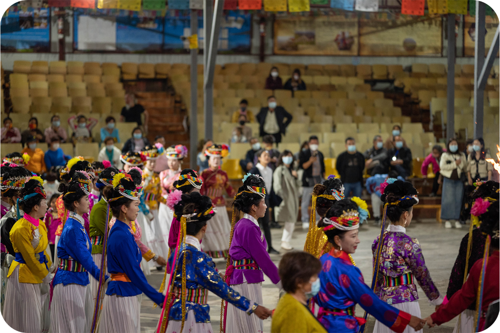 首先是晚会的热身环节,几十位身穿传统民族服饰的女子开始翩翩起舞。