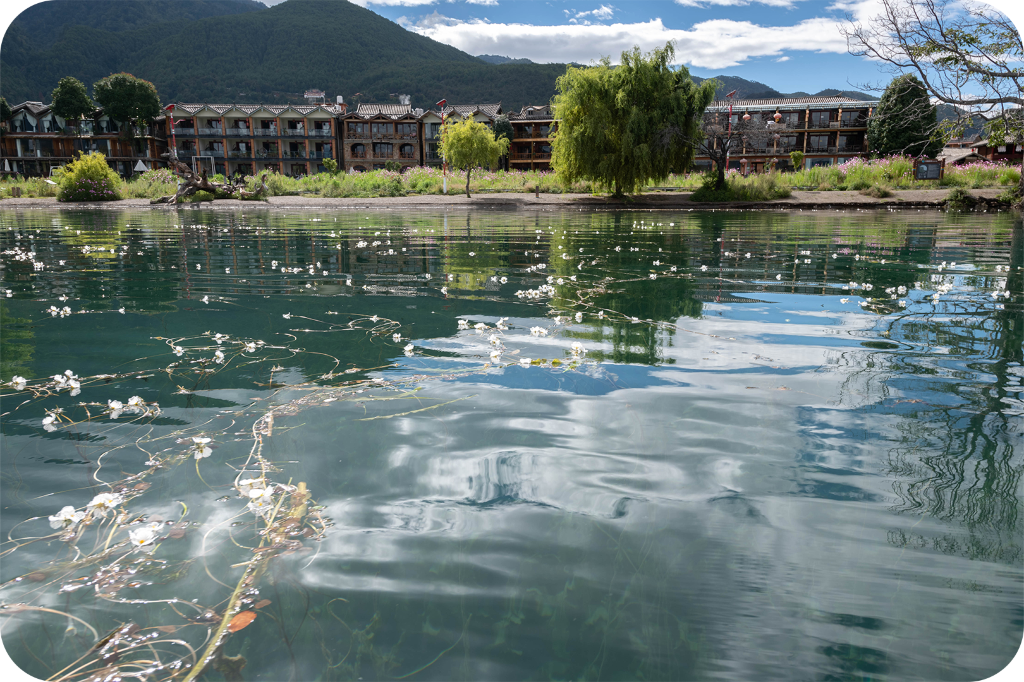 游船已接近大落水村,前面水面上的点点白色,就是水性杨花。水性杨花还未开花时候的部分,正是云南这边餐桌上的特色菜之一。