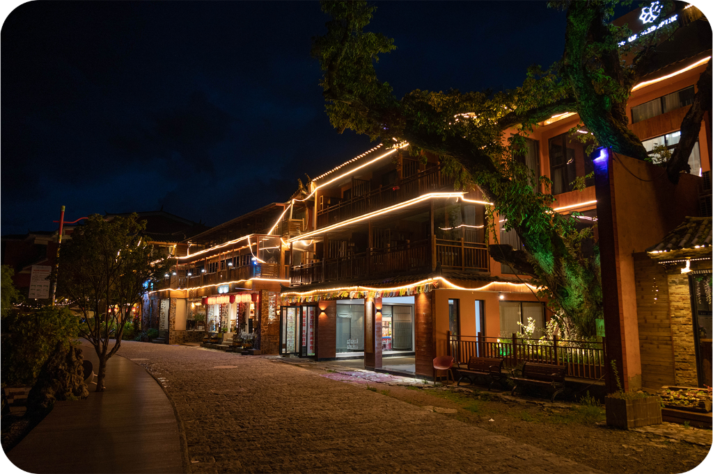 返回心宿客栈,下方的丽江古城已灯火通明,从露台眺望出去,开启了景观灯光的丽江古城非常漂亮。