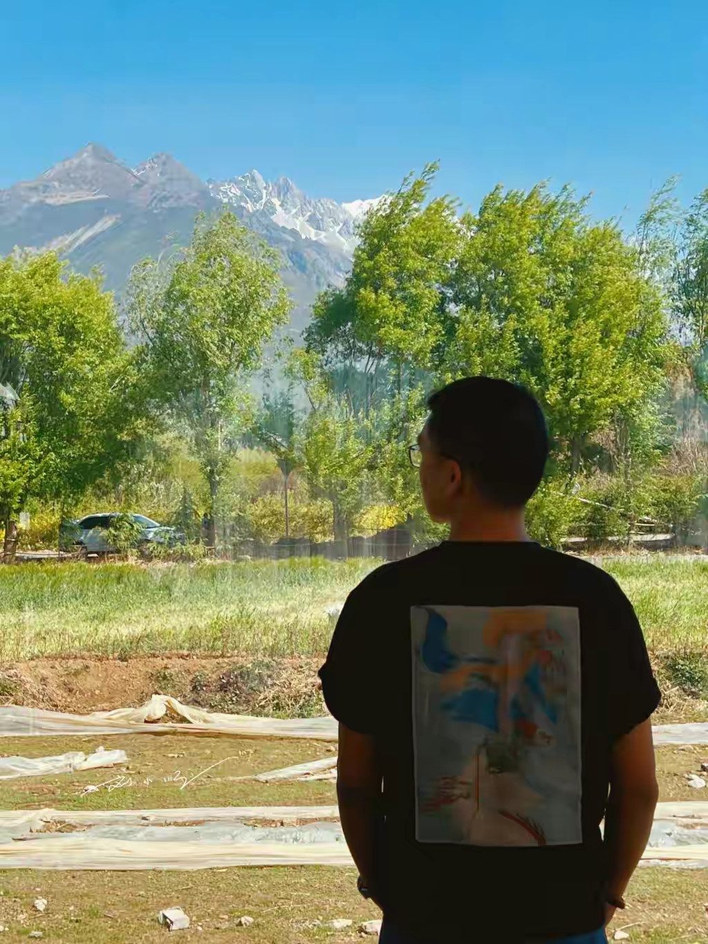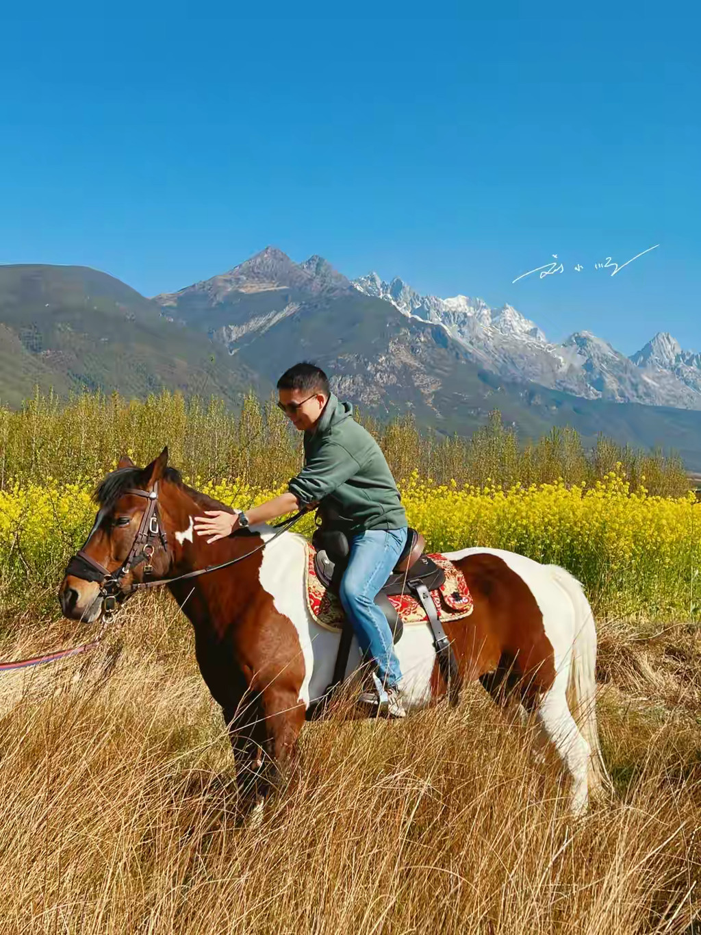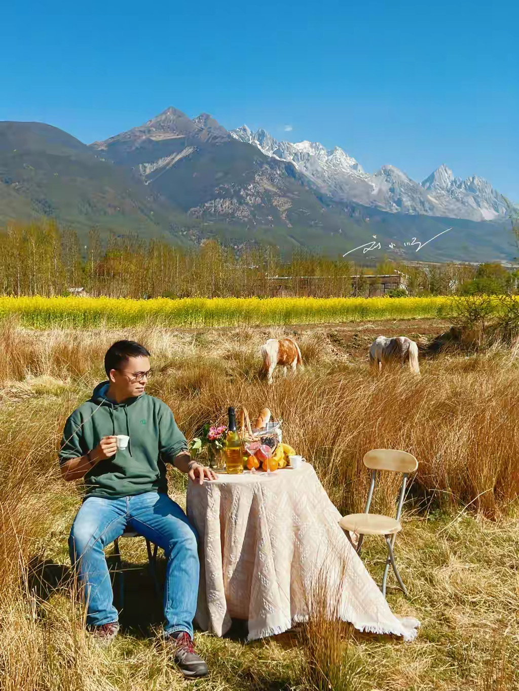 远处的皑皑雪山,搭配近处大片的油菜花田,以及丽江天空特有的高原蓝,不管什么精神内耗在这样的环境里都瞬间被治愈了。