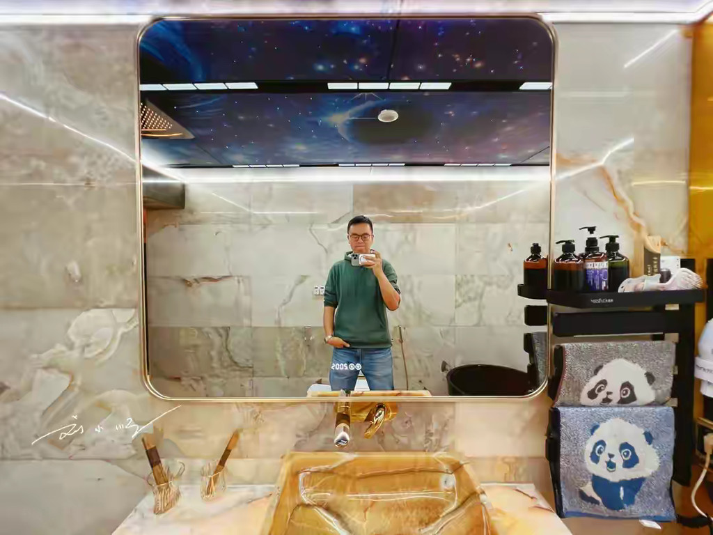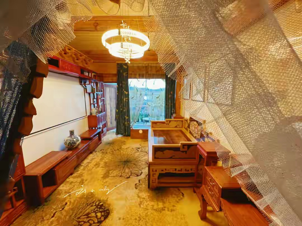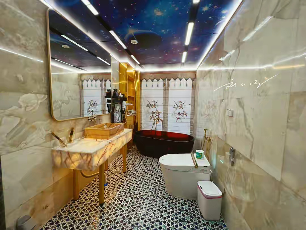 中式的实木家具,丝绸质地的床上用品,以及配套完整的卫浴空间,各种智能设备与家电一应俱全,连浴缸都特别富有有设计感。