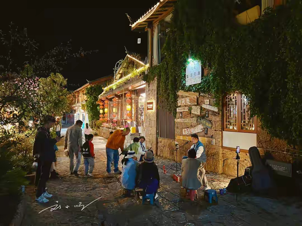 晚饭后,我到旁边的束河古镇里去逛了逛,可能时间太晚,大部分店铺都关了,游客也不多,但依然有流浪歌手坐在路边唱歌,一群人正在围着他听。