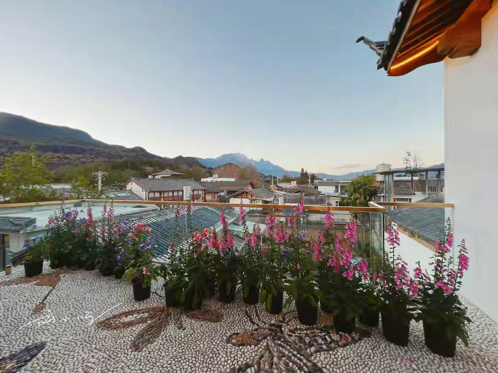 然后,我住进了“远方客栈”三楼一间可以在阳台上看见玉龙雪山的大大的房间。