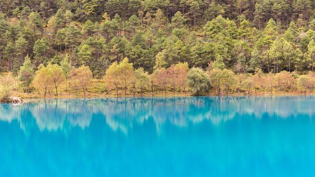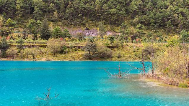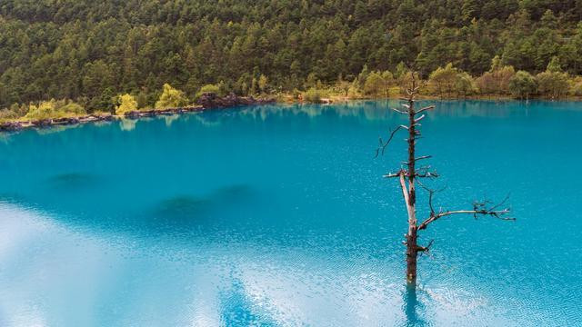 我们的第一站来了蓝月谷 蓝月谷有电瓶车,但是我建议大家徒步就好,距离不远,扎西一路上交待我们如果感觉身体不适一定要和他讲或者及时使用他给我们的氧气 像鸡尾酒一般的蓝月谷,在秋冬的时候能够看到底,扎西说那时候的蓝月谷边上是翠绿色的,中间是蔚蓝色的,但是到了下雨天,蓝月谷的湖水就成了牛奶白