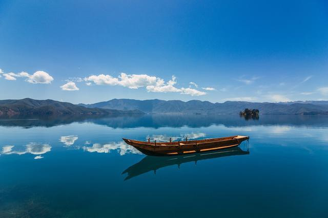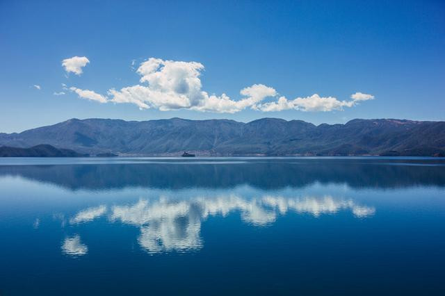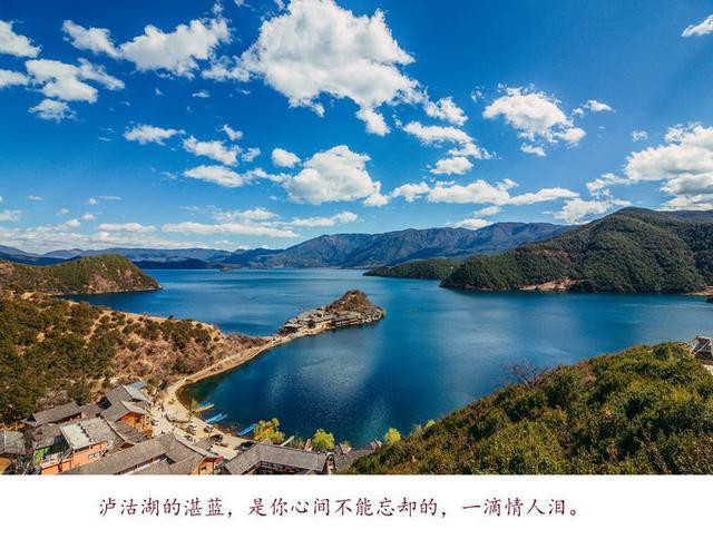 但泸沽湖的天气,却好似世事般无常。那清晨的阴霾,被一扫而光,云被吹散成片,飘在山间,泸沽湖的天,晴得湛蓝。