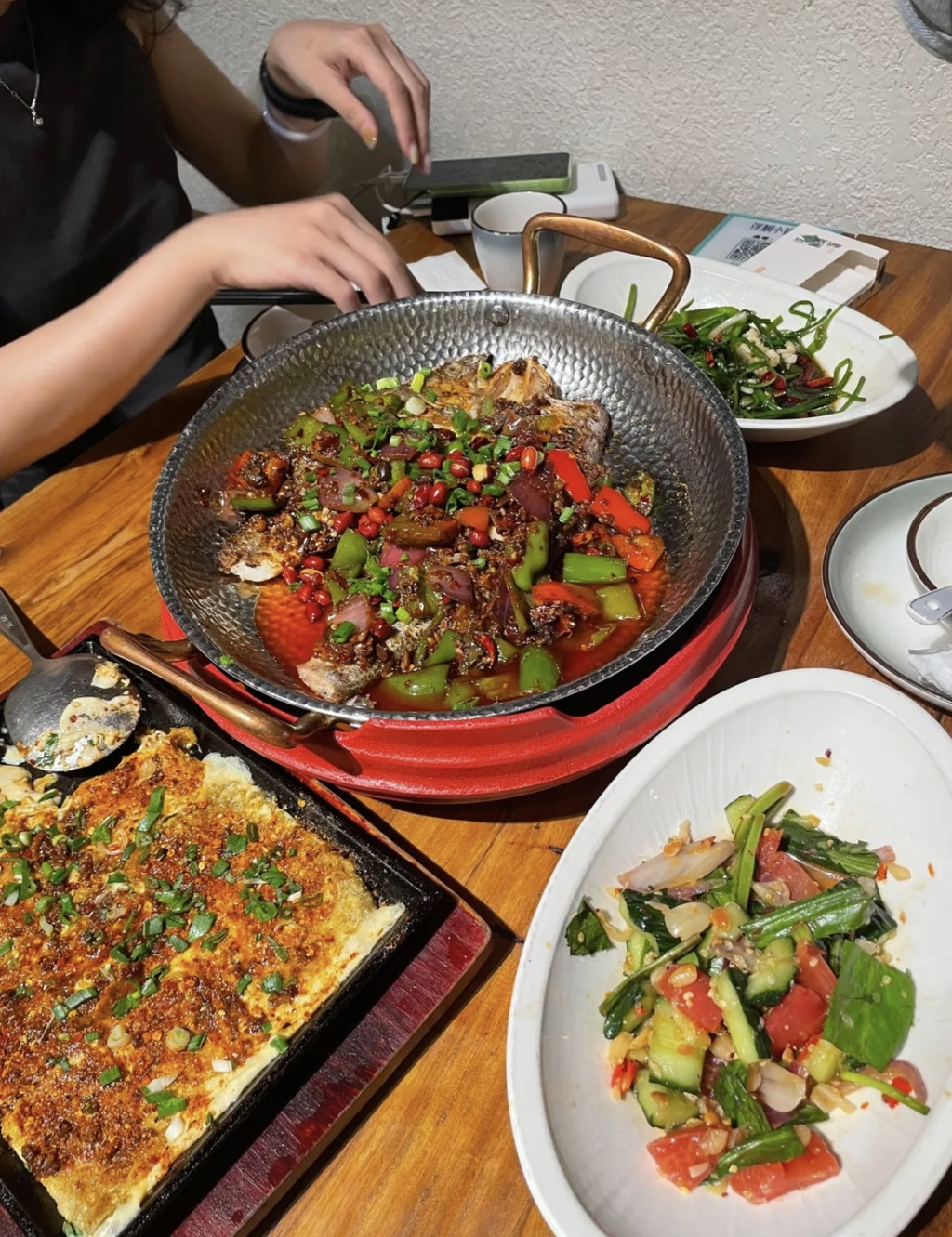 铁板包浆豆腐包浆豆腐刚上来那会还是有很多浆的,那种就是还没定型,但也可以吃,就是不太好切,不愧是包浆,外面的辣椒粉就是用来调味的,豆腐一口下去就能尝到滑滑嫩嫩的豆腐,比日本豆腐还要滑,是真的爆浆!