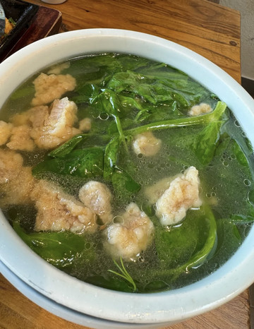 豌豆尖酥肉汤很清淡,吃饭谁不喝汤呀,豌豆尖的味道弥漫在嘴巴里,我很喜欢蔬菜的味道!