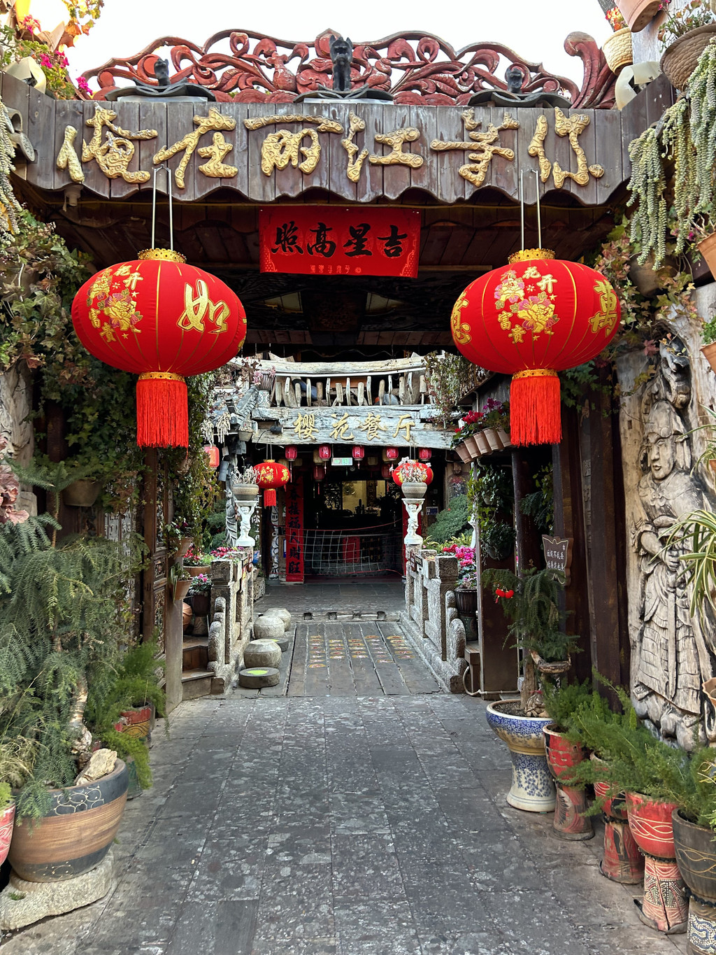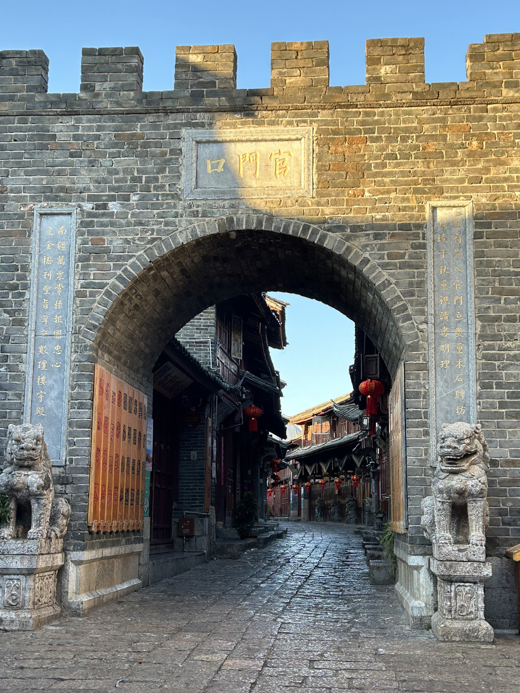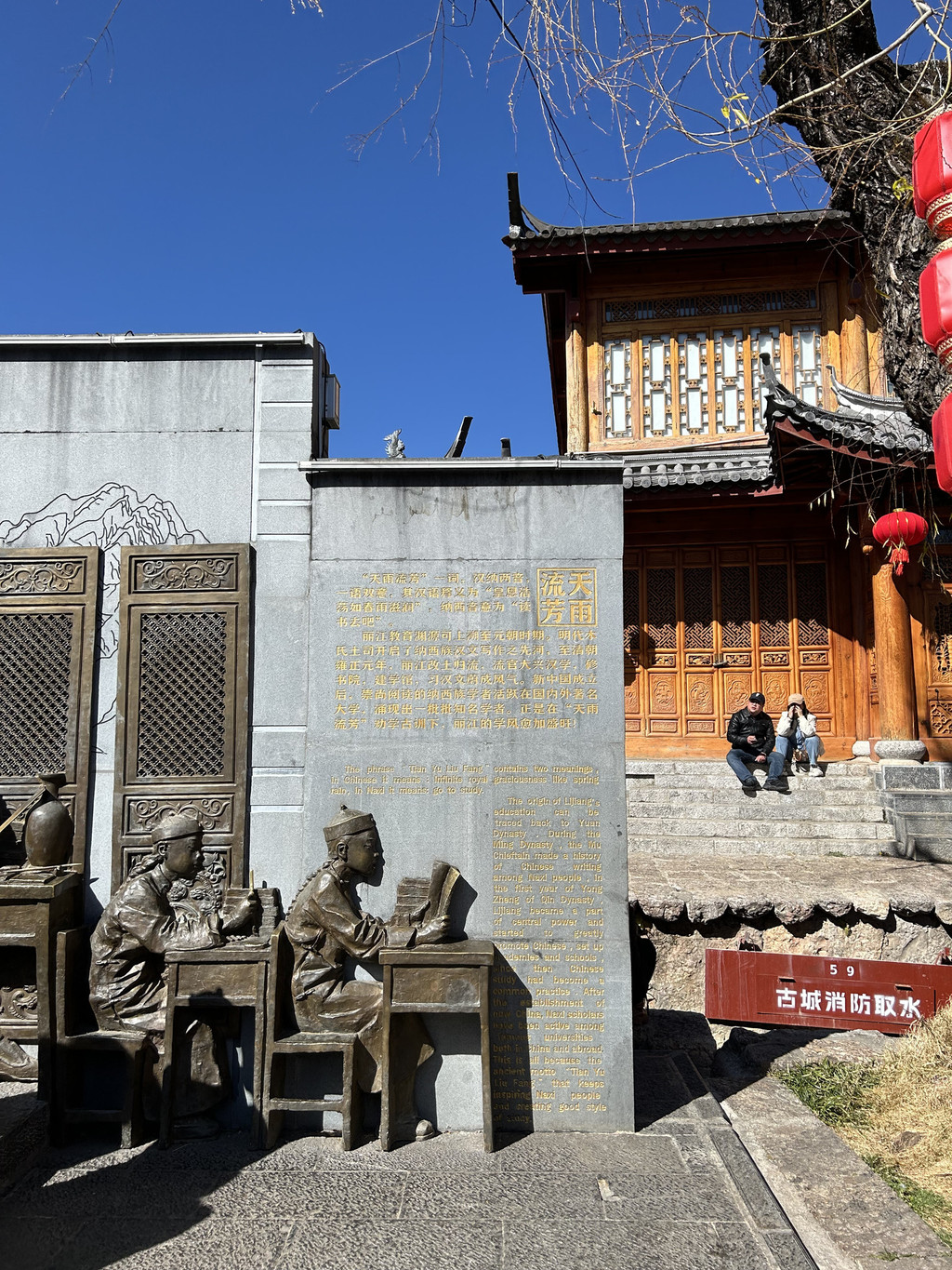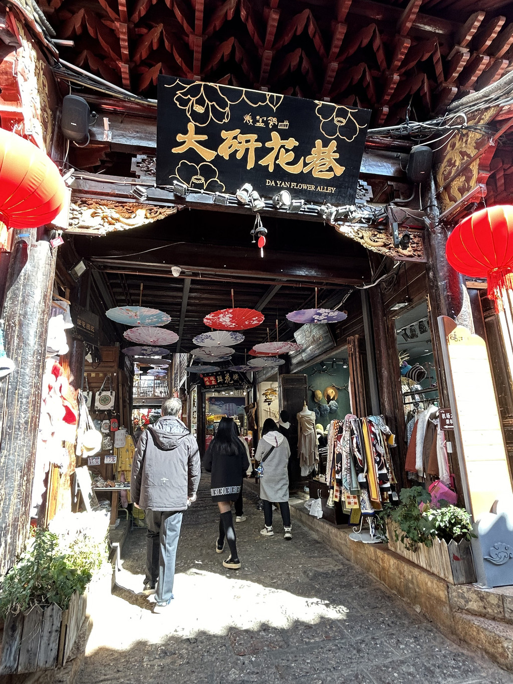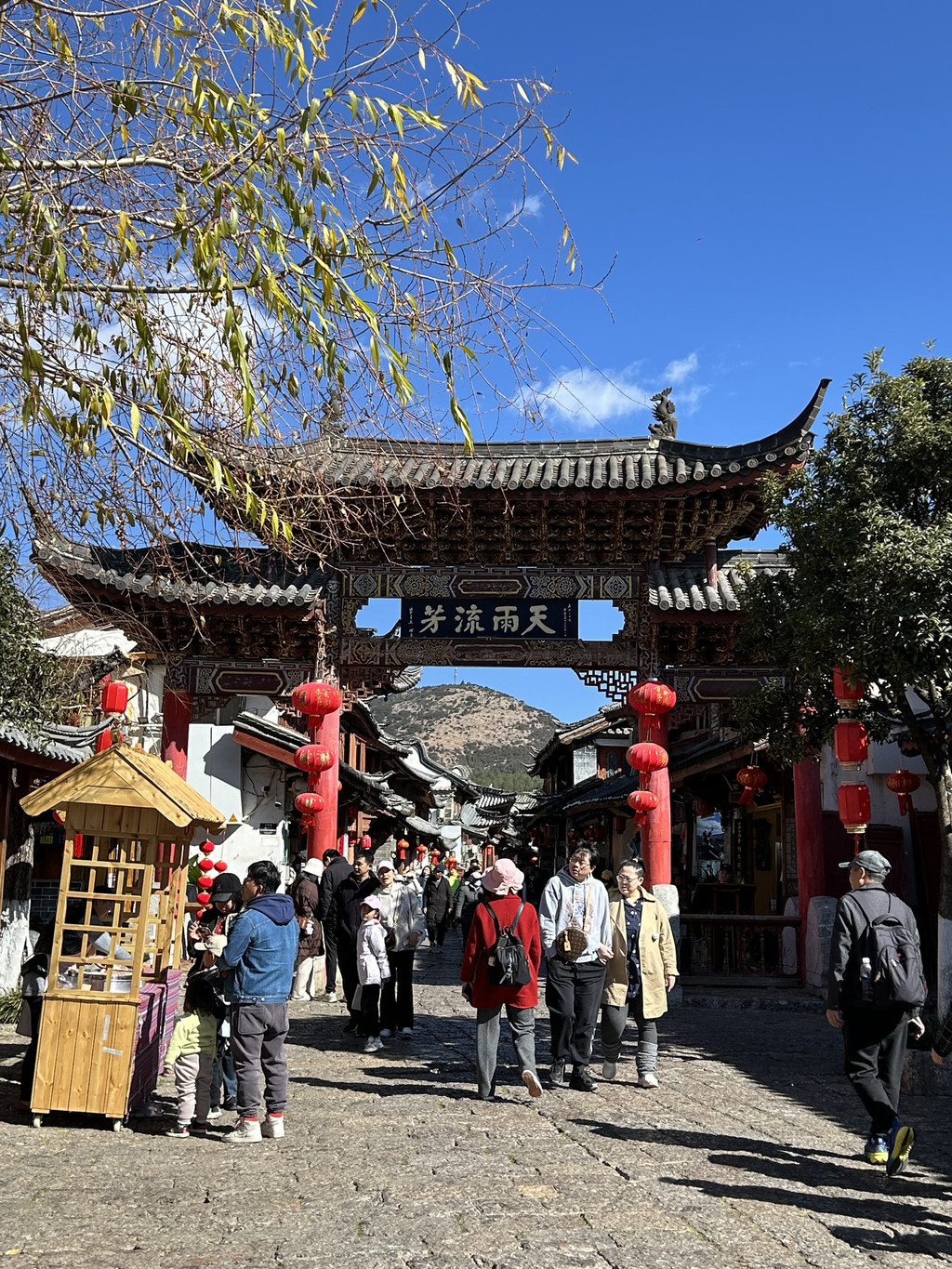 从木府出口出来,首先映入眼帘的是“天雨流芳”木牌坊,“天雨流芳”是纳西语“读书去吧”的谐音,可见木氏土司还是很重视文化教育。