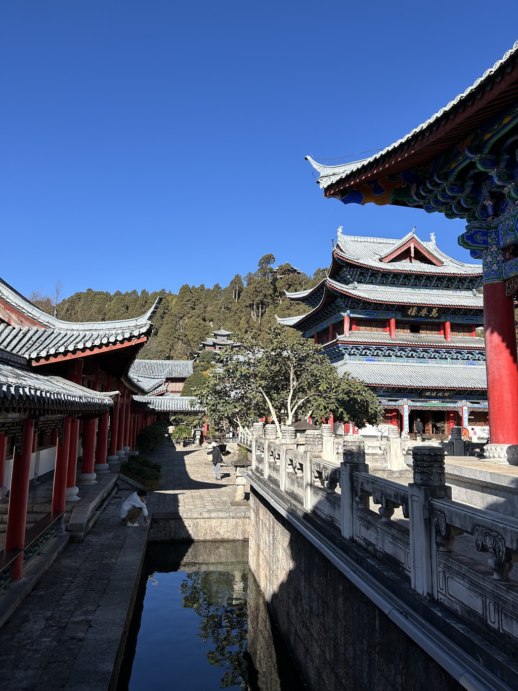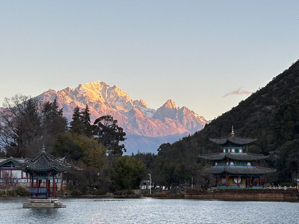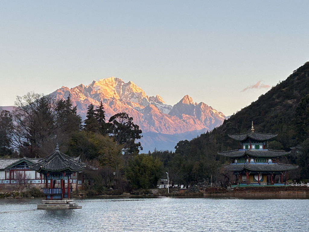 早上8点,我们来到古城黑龙潭公园,大门前行100米走到拍照绝佳机位--锁翠桥看到了日照金山和水面倒影,画面唯美震撼。