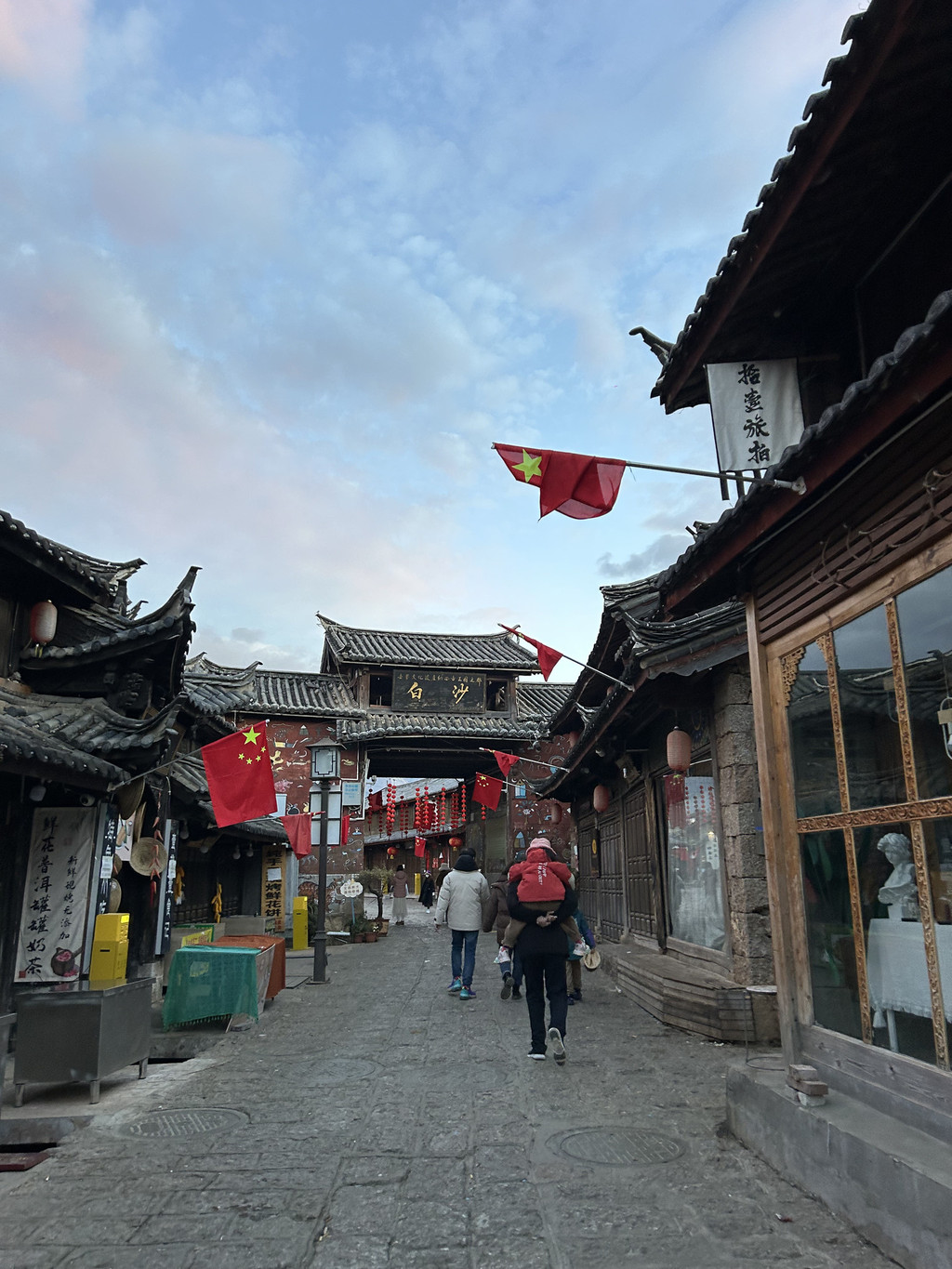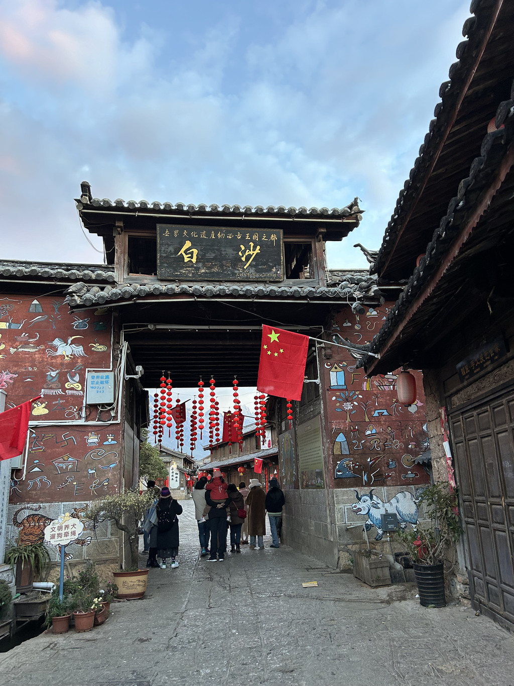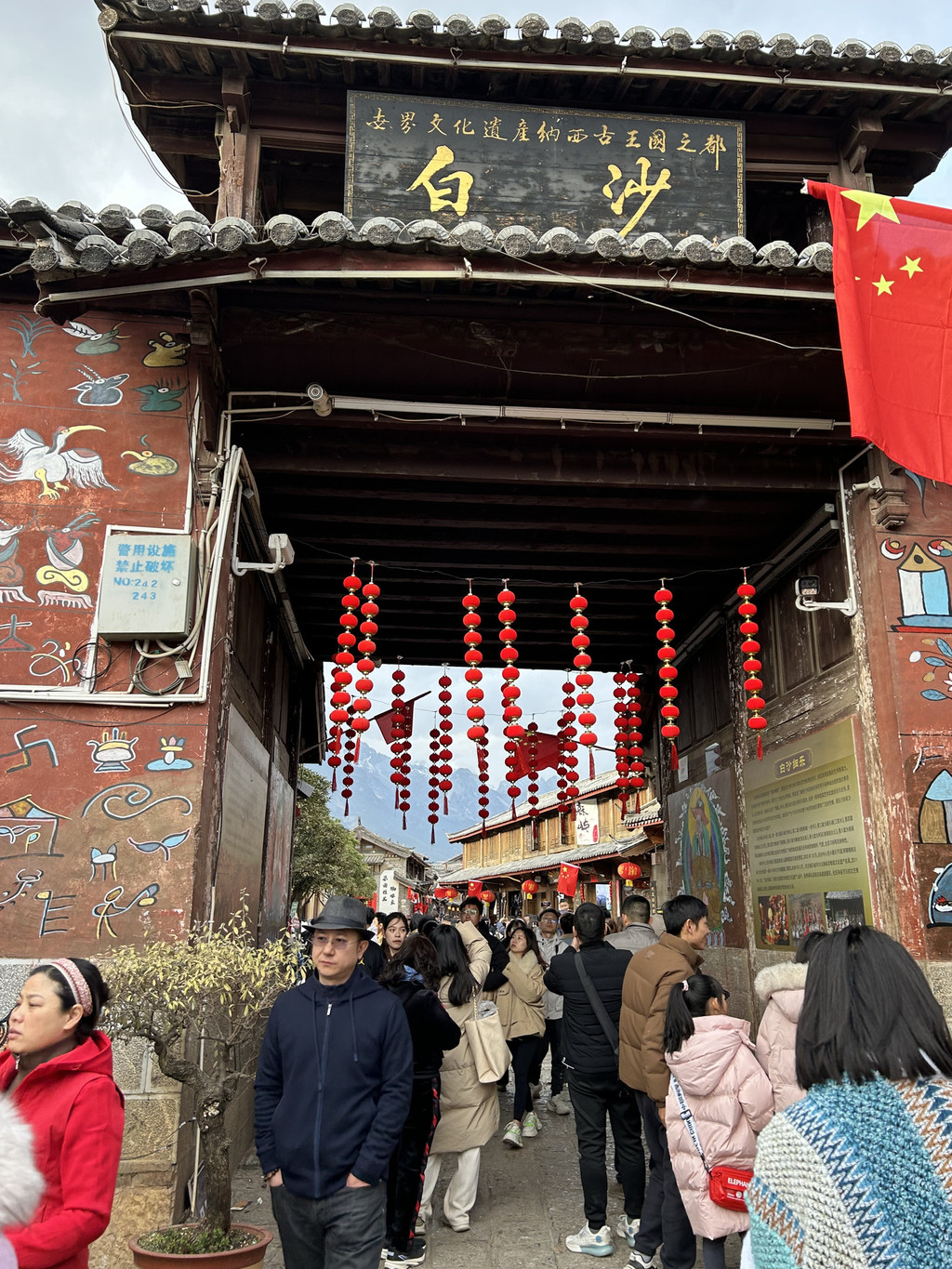 白沙不算大,整个古镇像7字型,主要街道就一条。四方街正南侧,立有一两层牌楼,上有牌匾“世界文化遗产纳西古王国之都白沙”。过牌楼正南是祥和安静的纳西住家,1000多年来纳西人在这里春耕秋收冬藏,过着与世无争的生活。