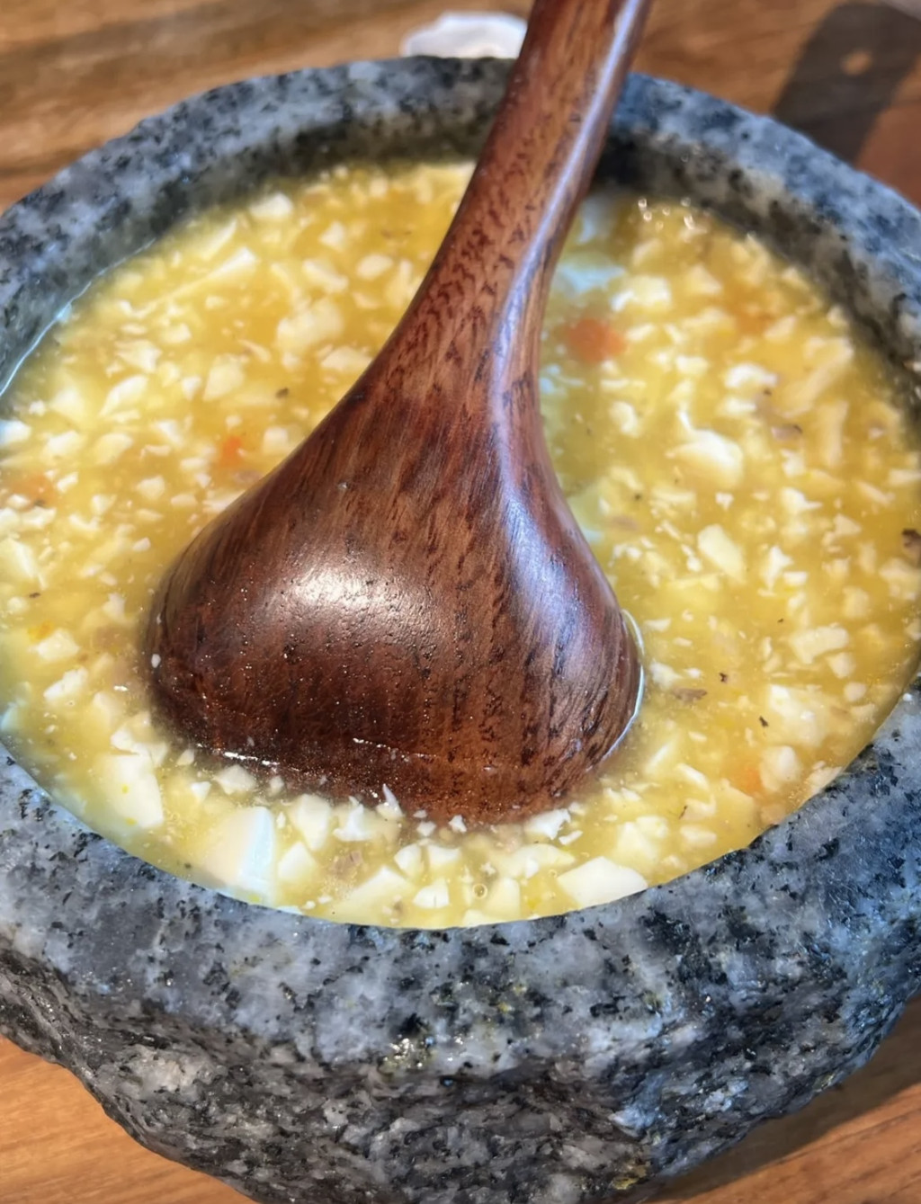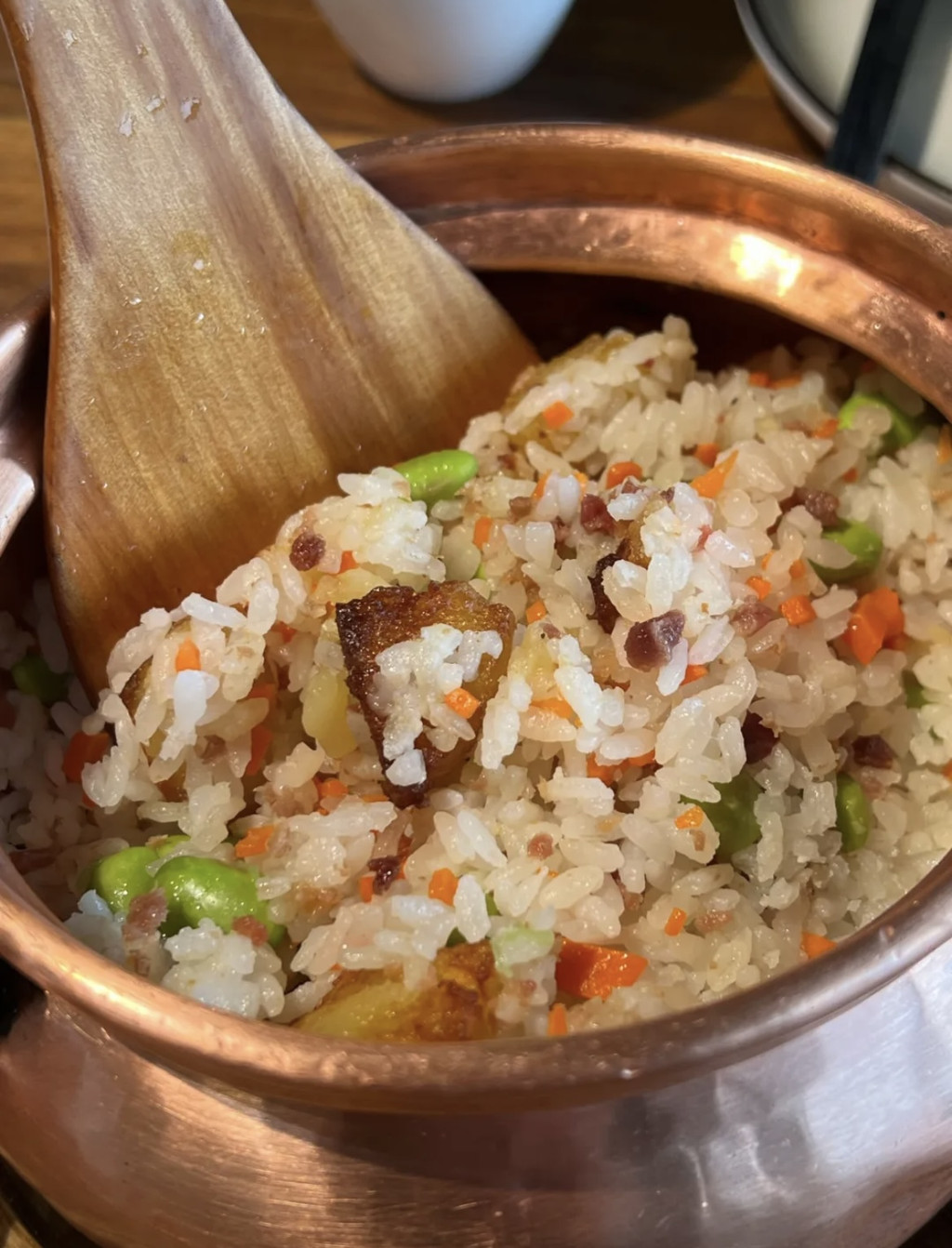 招牌小锅饭点了个小锅,两个人吃绰绰有余,有毛豆,腊肉,胡萝卜碎里面的,土豆是煎过的,特别香!