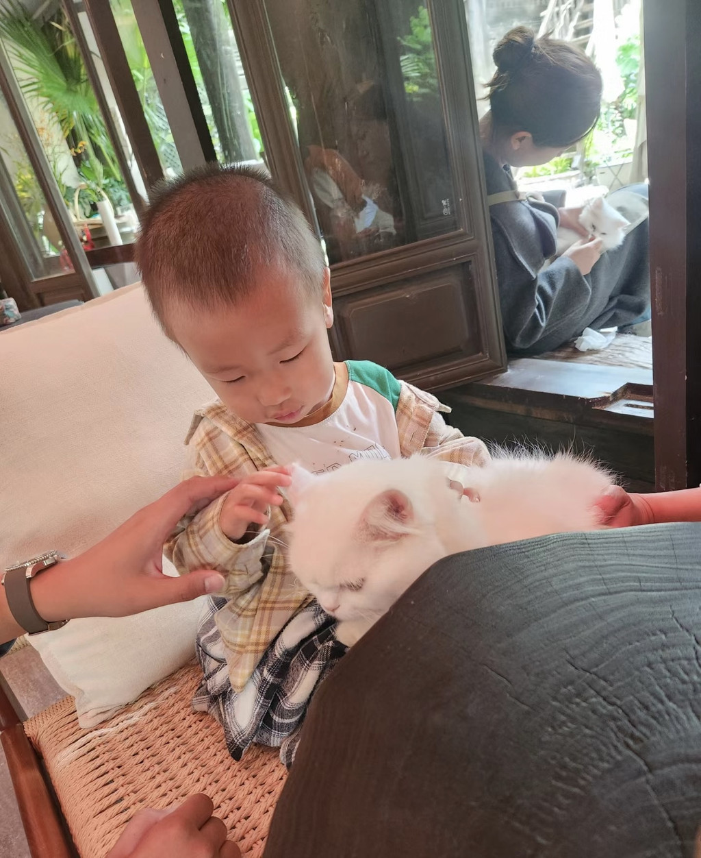 到了傍晚天气才放晴,晚上到附近商业街逛了一下。第三天早上去了丽江古城,推荐一家屋顶咖啡,不太好找,但三楼风景很棒,二楼有住宿,一楼环境也很棒。店里有三只猫咪非常可爱,孩子还跟着玩了很久,下次来民宿可以考虑这里,下午就飞机回家啦~