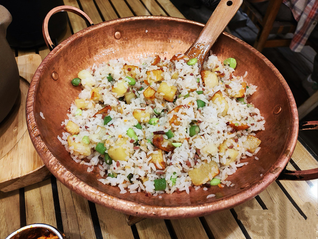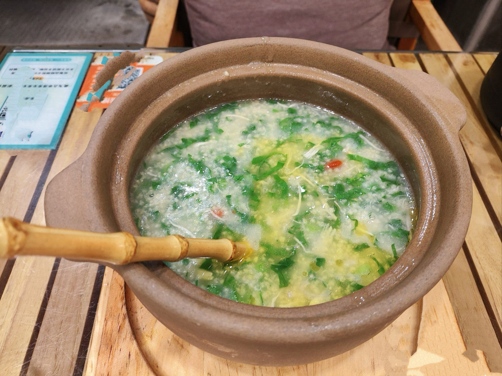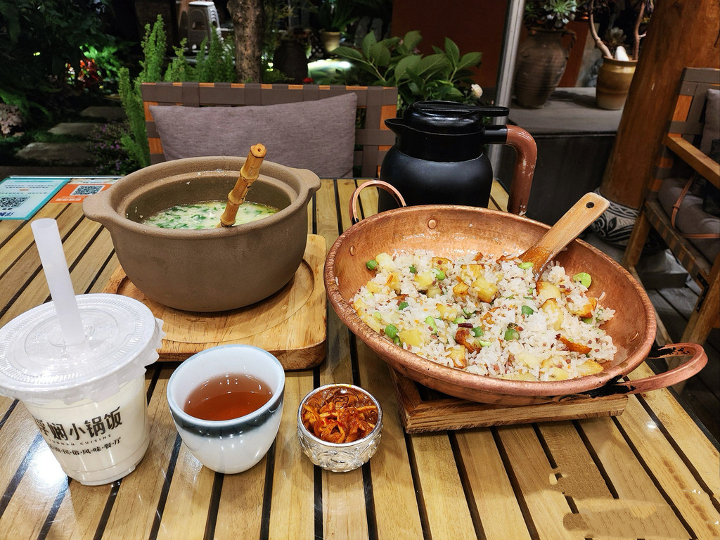 招牌小锅饭,小锅饭味道很棒,食材丰富,有土豆块、腊肠、胡萝卜、豆角、豌豆,锅巴焦香酥脆,口感很丰富,味道是咸香的。手工奶白酒这个很好喝,里面是牛奶和醪糟,非常清爽!鱼鸡丝米汤青菜煲,青菜煲很鲜,味道比较清淡,但是很适合我的口感,全部吃完了。