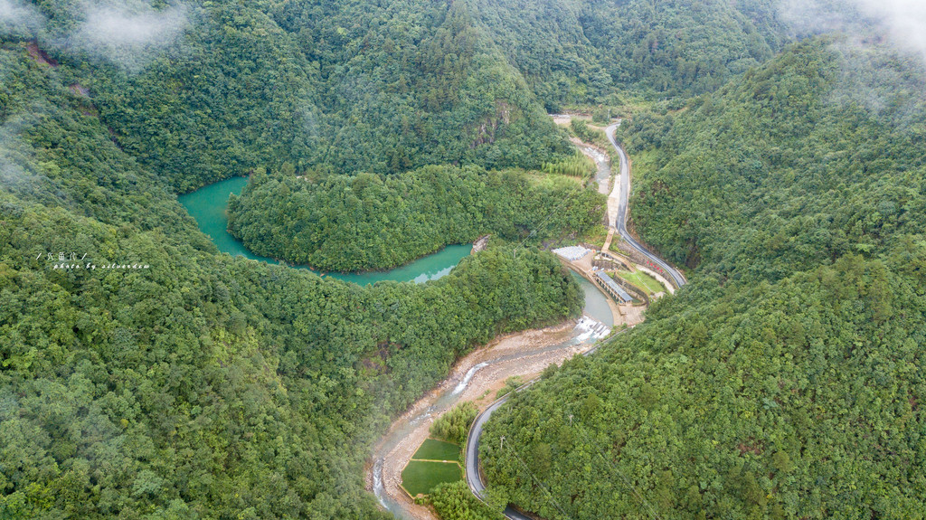 蜿蜒的公路与溪水并行于山间,听着潺潺流水,看着云清风淡,行云流水般的山路镶嵌于山谷之中。