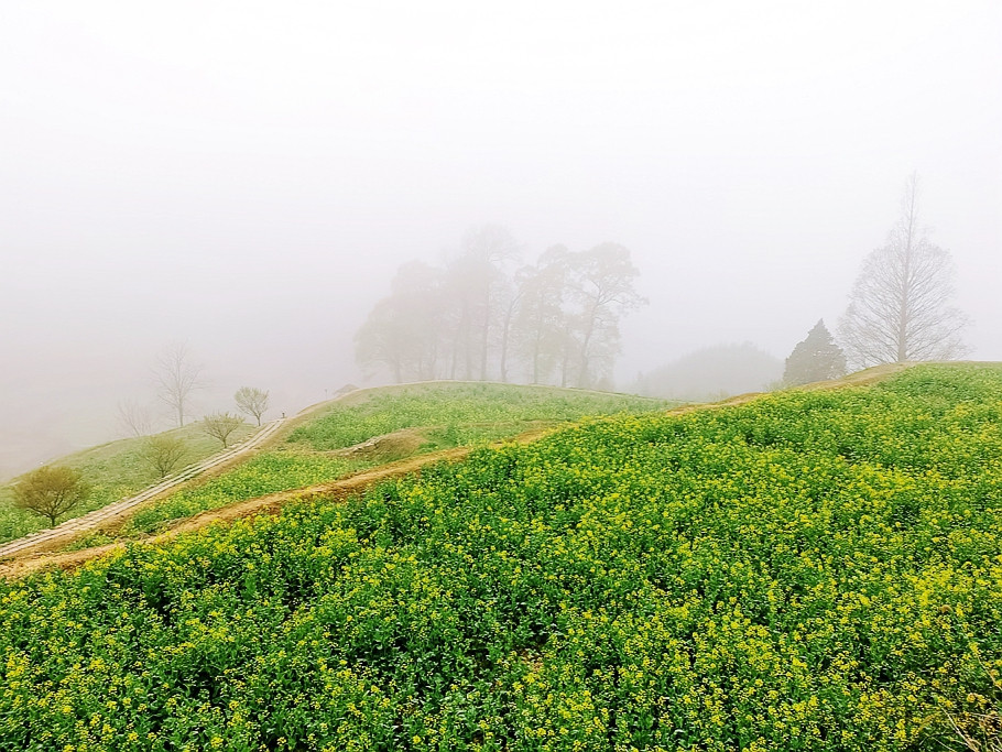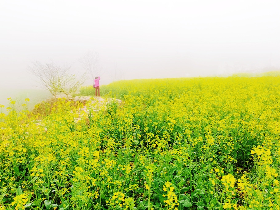 梯田里只能看到近处的一片油菜花,远处的山脉被淹没在茫茫雾海之中。