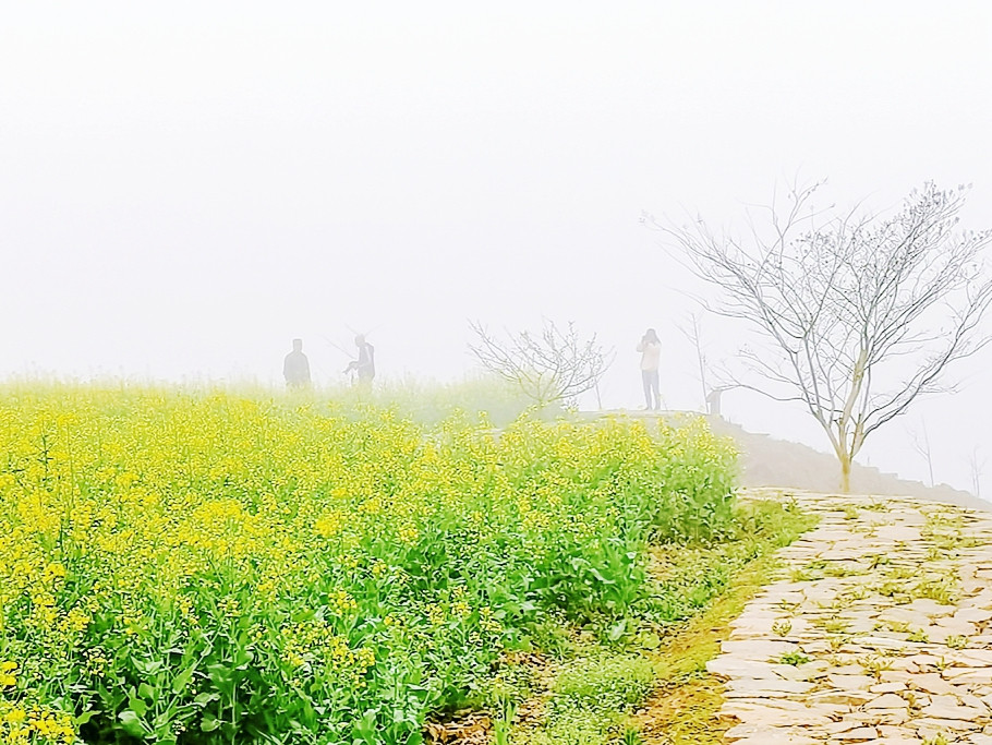 走上村外的山坡,坡上是胡家头山塘,山塘边有大片盛开的油菜花。