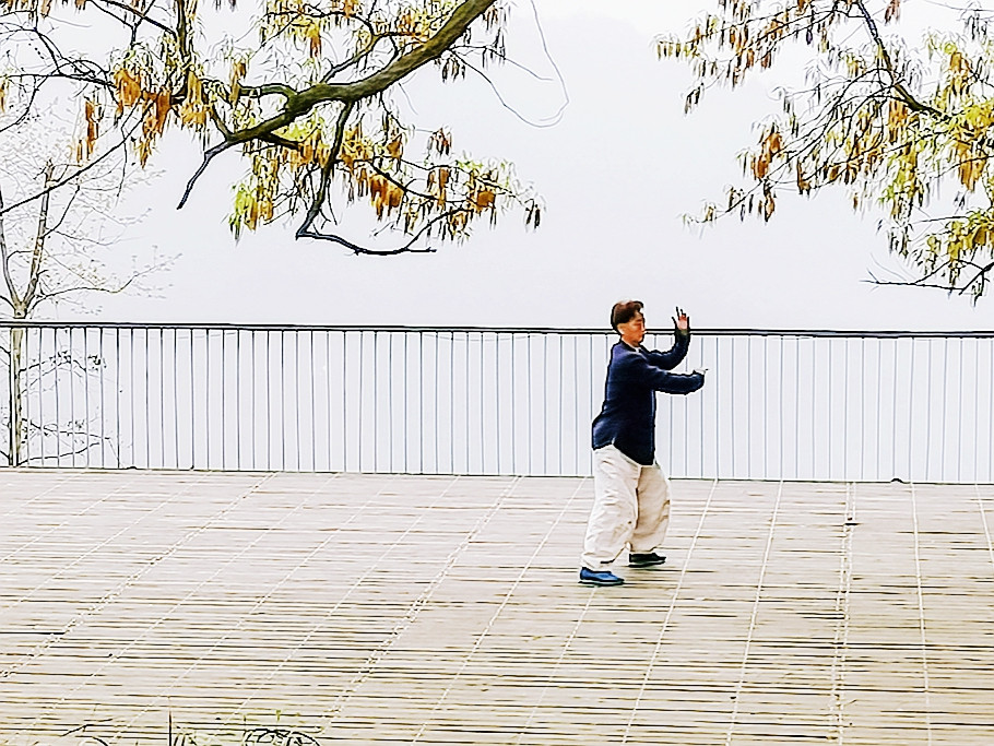 村民在天池边,伴随着舒缓的音乐正在打太极拳。