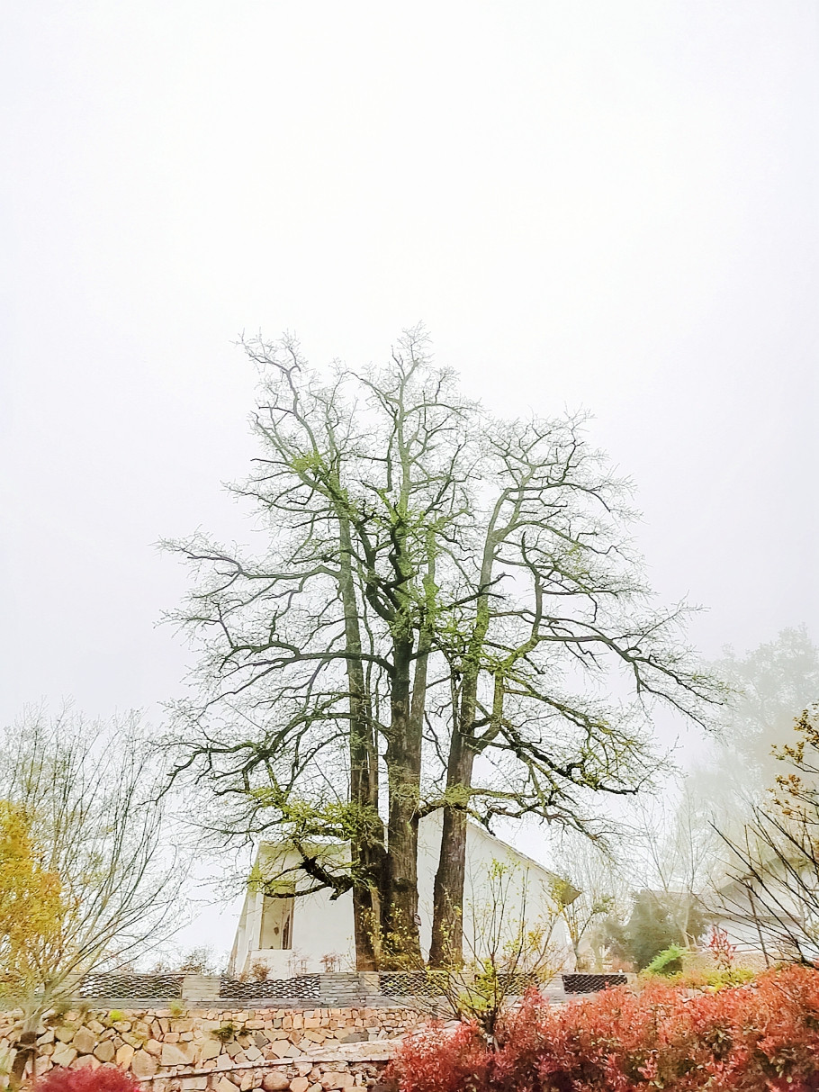 雾中的“千古相望”。这棵古银杏与天池边的四姐妹古银遥遥相望,母亲站在这山坡上望着远去的子女,依依不舍,此处故名“千古相望”。