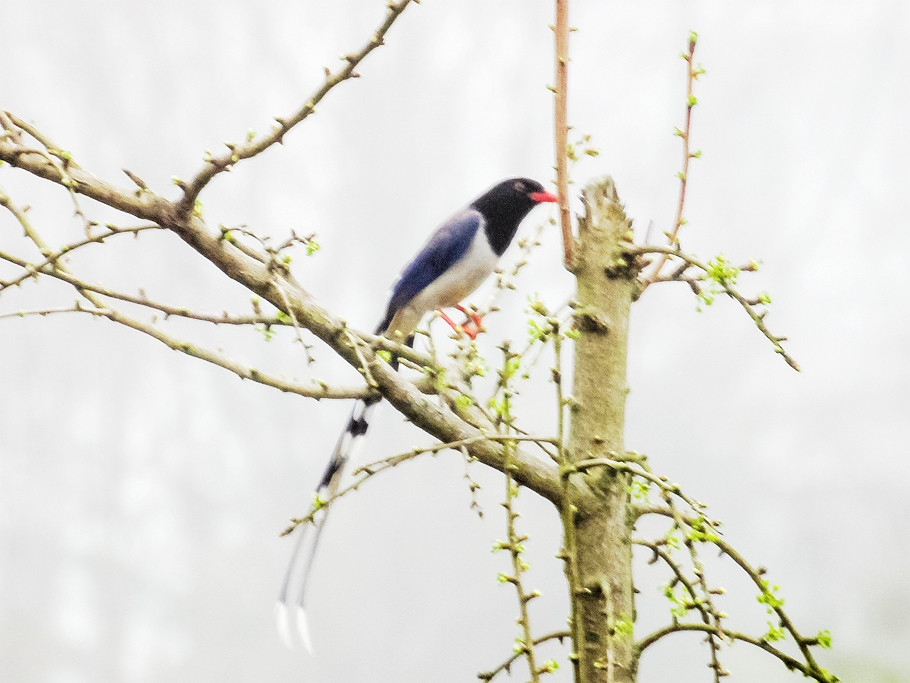 山坡上空无一人,耳边响起的都是山林中清脆的小鸟鸣叫声。这是一只红嘴蓝鹊(别名长尾山鹊)