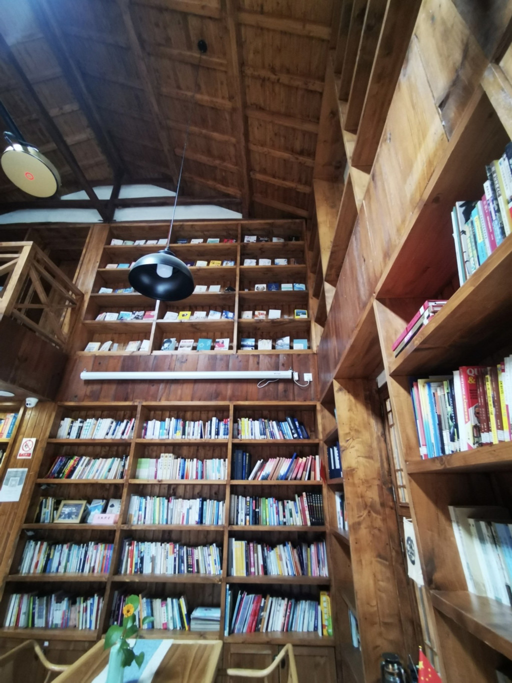 传统木制小楼结构,两边都为书架,书架上都放满了书籍,书籍涵盖了范围广,有文学类,美学类,小说类,
