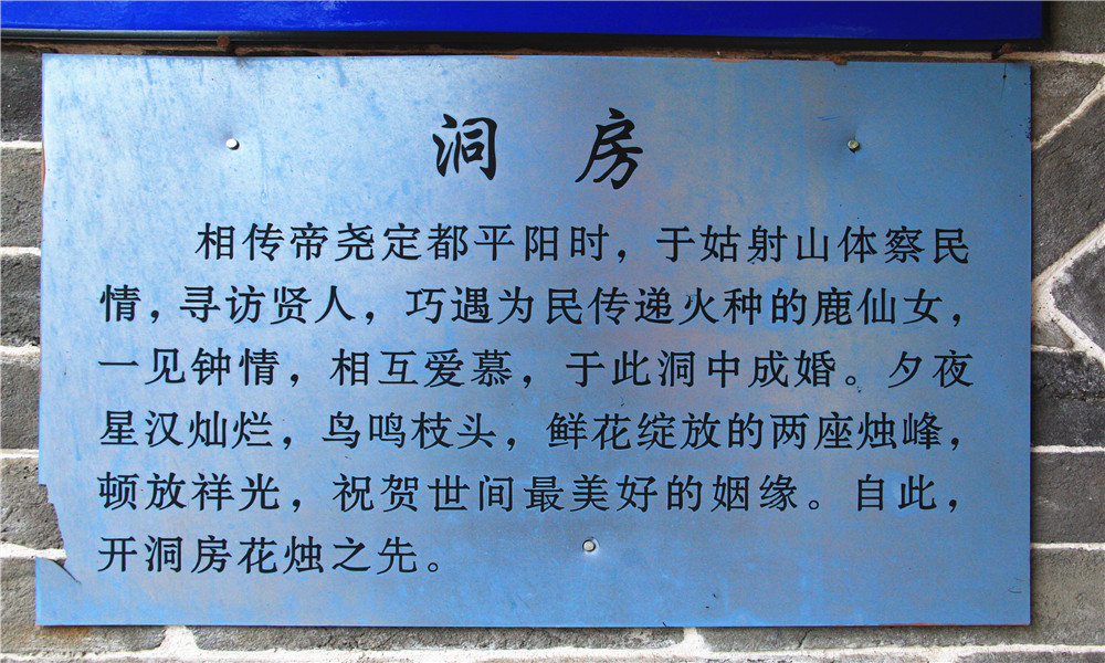 姑射山相传为尧夫人鹿仙女诞生地,因春秋时期著名哲学家庄子的《逍遥游》中有"藐姑射之山,有神人居焉;肌肤若冰雪,淖约若处子;不食五谷,吸风饮露;乘云气,御飞龙,而游乎四海之外;其神凝,使物不疵疠而年谷熟。"之语而出名。