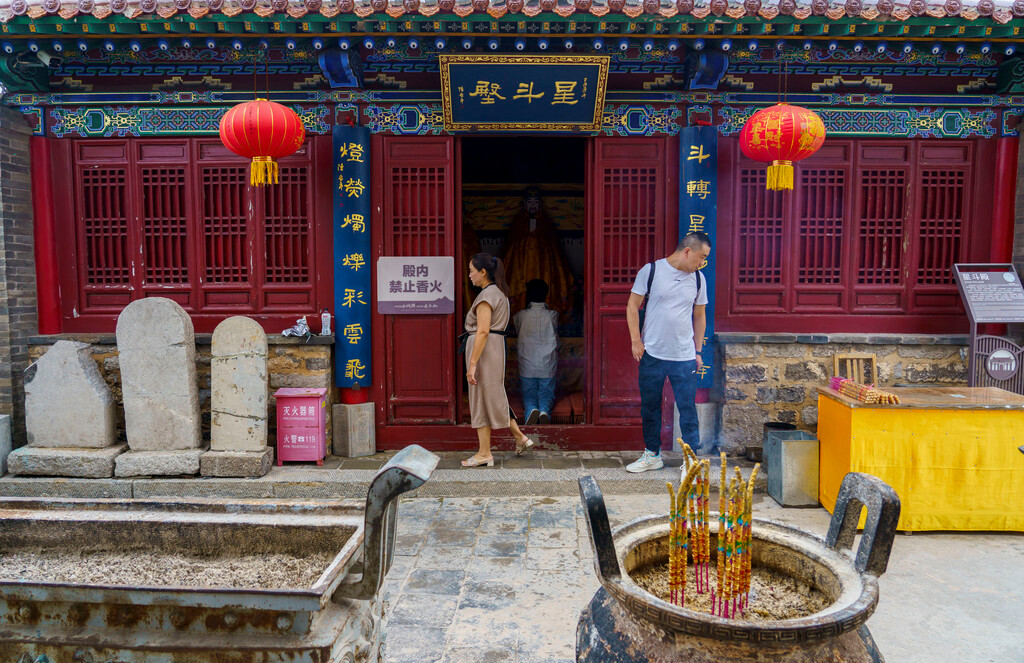 整座建筑分为三层,与平台还有一列台阶的距离,应该是道家亲近上天之意;走上来之后看到的确实也是如此,一楼就是玉皇顶道士的居住之所,二楼则是星斗殿和无梁殿,供奉着诸天神明,可以看到香火还挺旺盛,殿外的香炉一直没有停过。