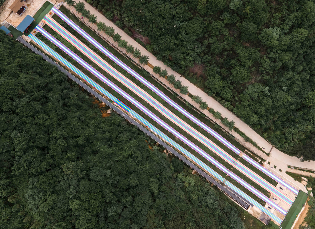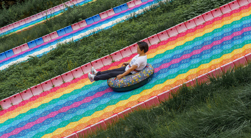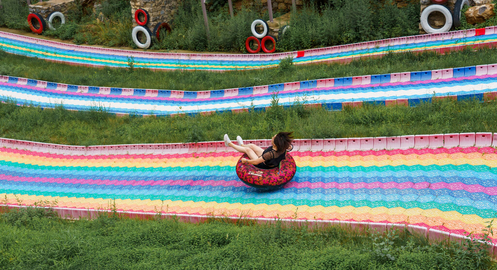 在滑翔伞下面五十米的位置,就是云丘山另外一个深受游客喜爱的项目【旱地滑雪】,这里在斜坡上打造出了一个可以滑雪圈的彩虹坡道,因其倾斜角度大、速度快、颜值高等优点,也是受到了旅客的一致好评。
