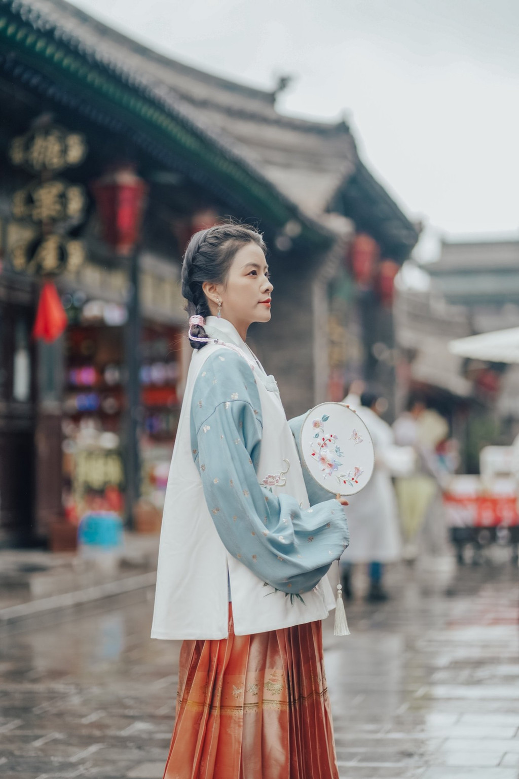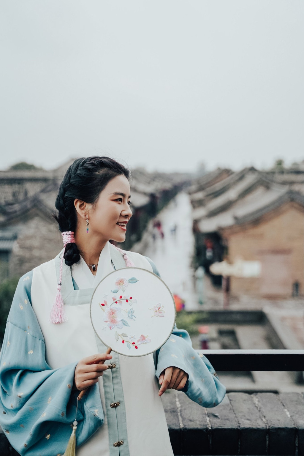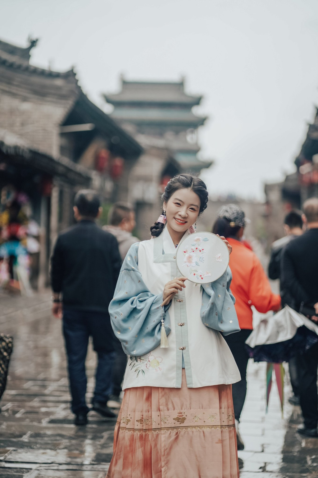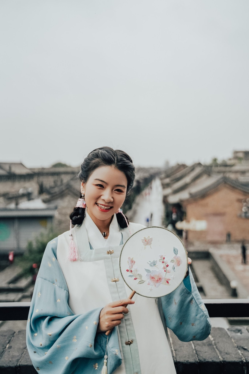 而今,千帆过尽,古城里民风和乐,原住民与游客络绎不绝,明清街巷熙熙攘攘,岁月风平。穿一袭汉服,做一日晋商老爷府上的千金,团扇一握,俨然大家闺秀的作派。