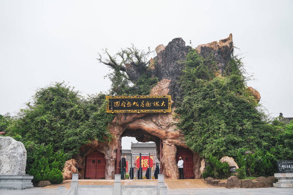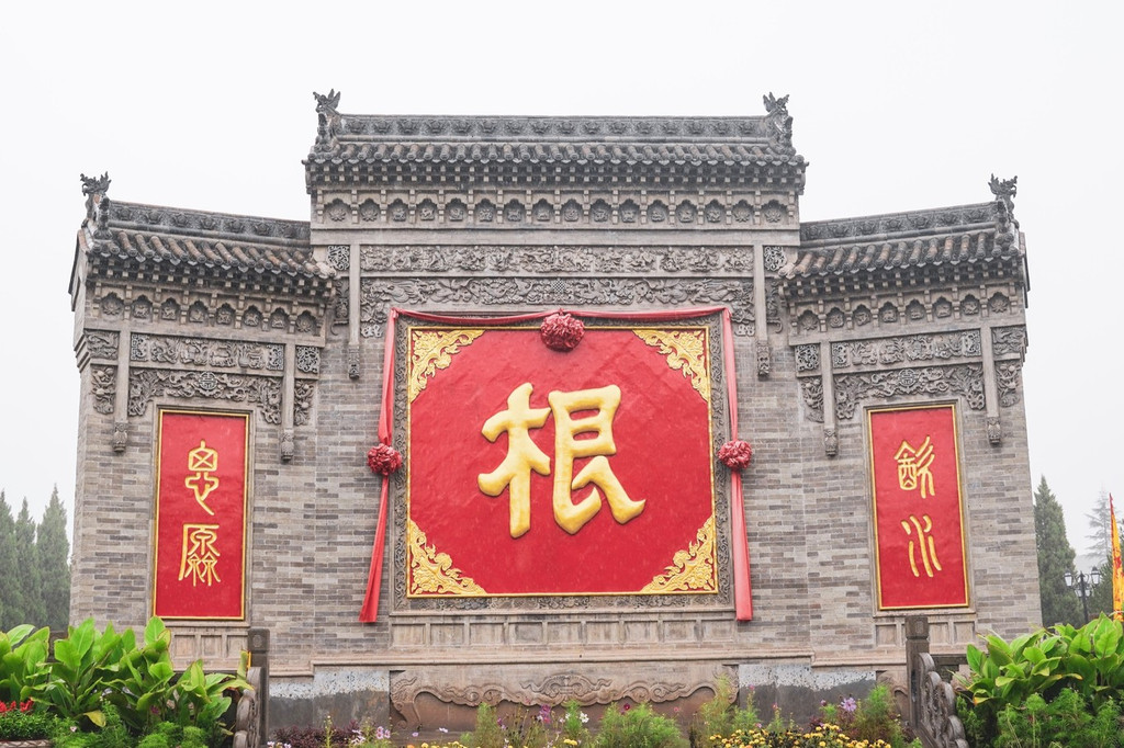 气势磅礴的“根字影壁”上,根字的木字旁像一个人高昂着头大步向前走路的样子,而根字最后一笔又像是一个人高高抬起不愿落下去的脚步,寓意着当年移民先祖久久不愿落下的沉重步伐和现在移民后裔急切回家纷至沓来的情景。