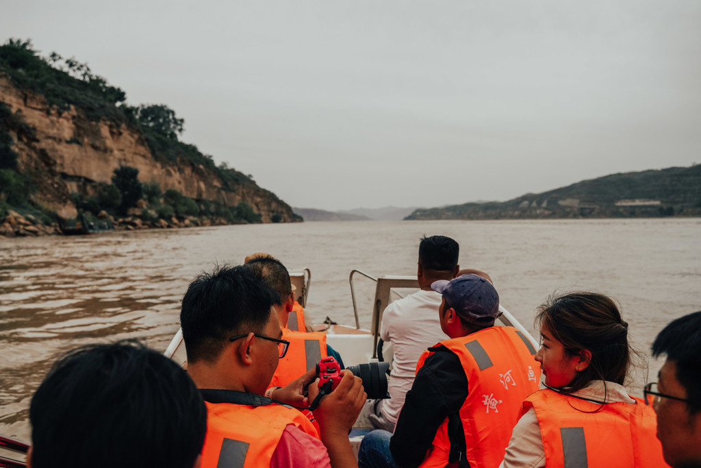 坐在露天观众席,一场 碛口 人与黄河相依相搏,巨浪中讨生活的激昂画卷缓缓铺开。随着剧情发展,跟着演出中说书人的脚步,一队迎亲车马的唢呐声,落座于以 碛口 古镇街景为背景的360度露天旋转台,观赏着“九曲黄河第一镇”百年来的商贾传奇。