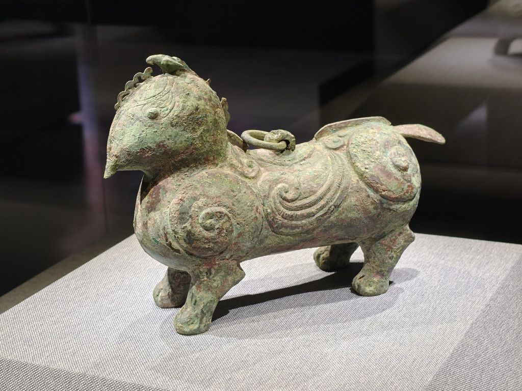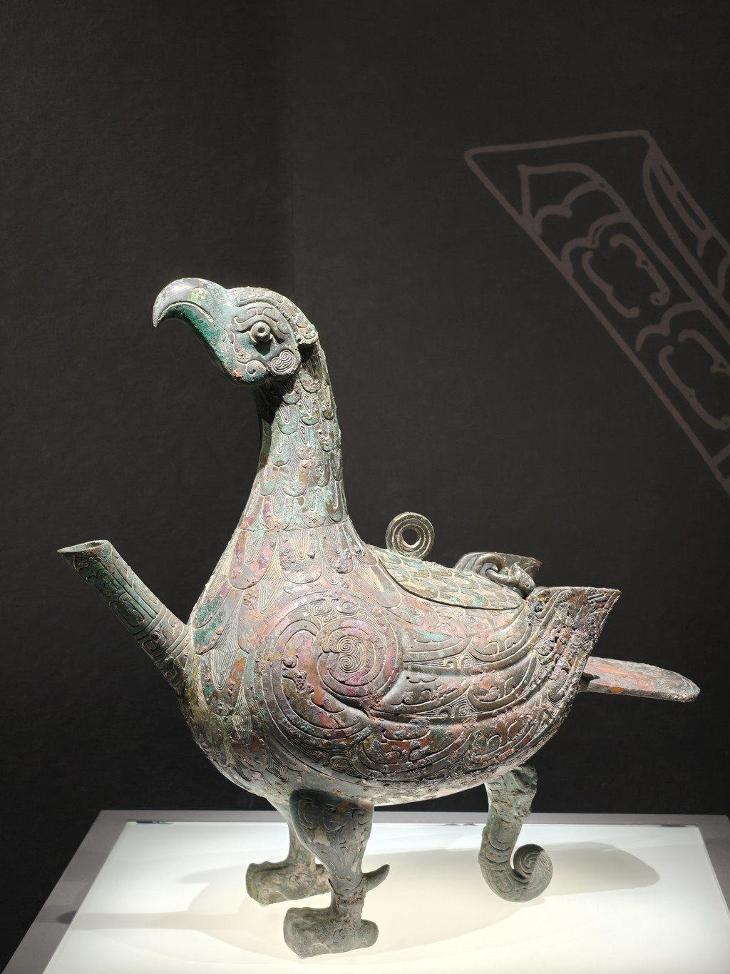 晋侯鸟尊高39厘米,长30.5厘米,宽17.5厘米。鸟尊的盖内和腹底铸有铭文“晋侯作向太室宝尊彝[yí]”,铭文中“向”一字,做“享”解,意为“贡献”。尊作伫立回首的凤鸟形,头微昂,圆睛凝视,高冠直立。禽体丰满,两翼上卷,在凤鸟的背上,一只小鸟静静相依,并且成为鸟尊器盖上的捉手。双腿粗壮,爪尖略蜷。凤尾下设一象首,惜象鼻残缺,依据象首曲线分析,象鼻似该内卷上扬,与双腿形成稳定的三点支撑。鸟与象这两种西周时期最流行的肖形装饰完美组合,造型写实、生动,构思奇特。