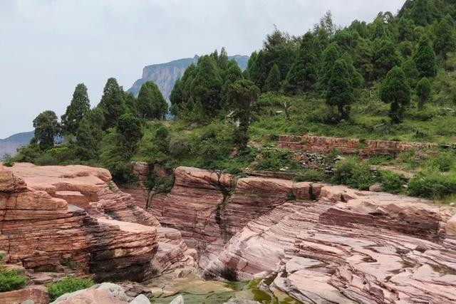 老龙口被流水风化切割的岩石裸露成一层一层的纹理结构。红色的岩石看起来甚是好看。丹崖绝壁美到惊艳。