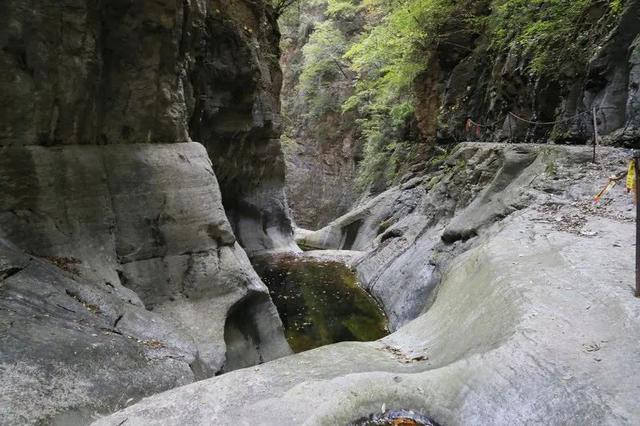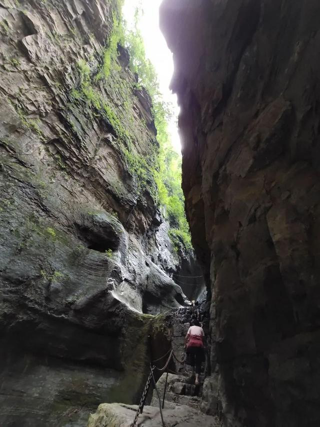 峡谷最窄处仅十多米宽,两侧绝壁,中间有连续跌落的数个深潭。潭壁光滑,呈锅底状。潭水墨绿色,不知有多深。原来仅靠石壁上凿出的窝坎攀行,现在虽然固定了铁链保护,但行走其间,仍旧是胆战心惊。