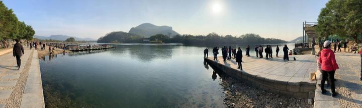 没想到,大圩古镇边的漓江现在变得很漂亮了,水很清,倒影非常清晰,建了一条水泥加鹅卵石的路,还有渡船码头,刚好一条渡船开过来停靠,还是有挺多人做渡船的,因为对面是一个岛,得坐船才能过去。