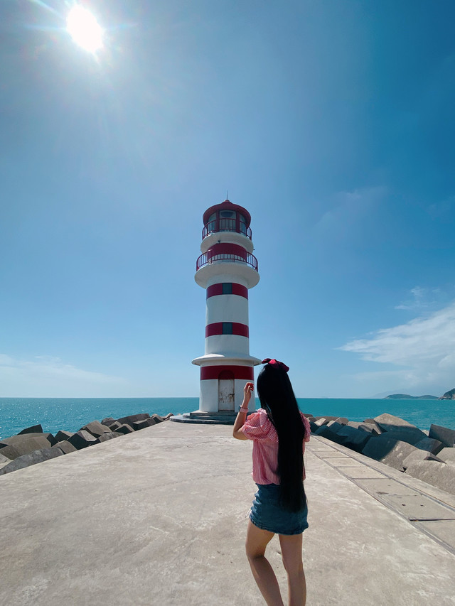 过了石梅湾后,在万宁沿海公路上有一座月牙形的神州半岛,半岛上有一座屹立在海湾上红白相间的灯塔,置身在海平面上,与海滩呼应着。