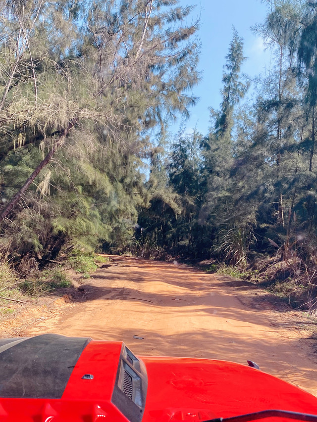 上面的图是地图上“木兰湾”定位的附近所拍摄的,在快抵达目的地前的路上有几条通往海的分支岔口,如果看到地上有轮胎印,可以试着往里开一下(不过也有可能会直接开到当地居民的村子里…),但一定有路是可以开到沿海边的,需要花时间摸索;这一片是没有成片的沙滩的,都是泥土和石头,开的时候一定要小心别用力过猛直接冲下去了。