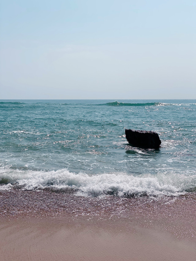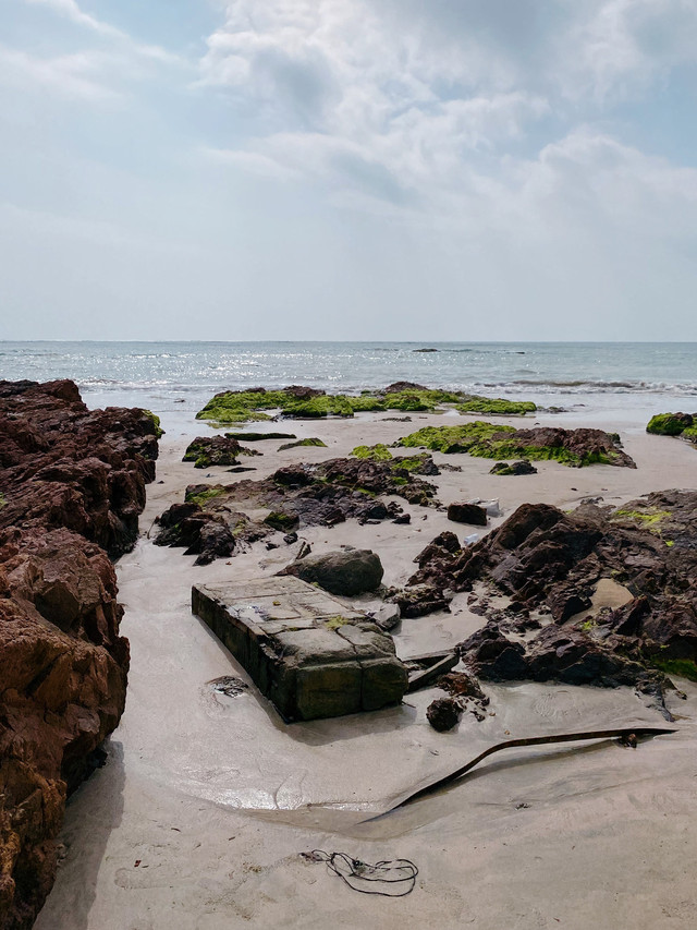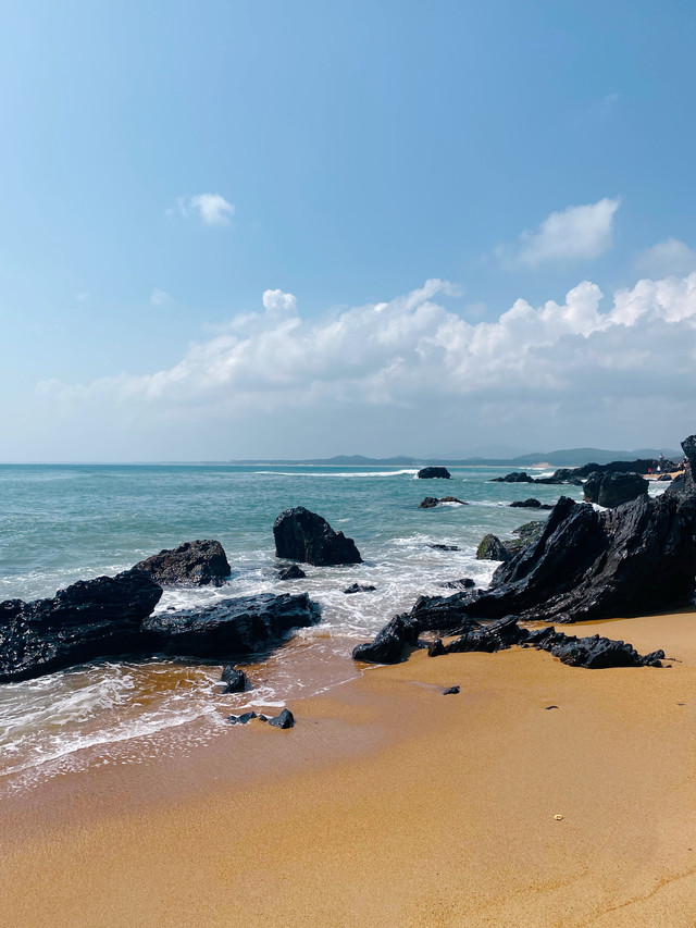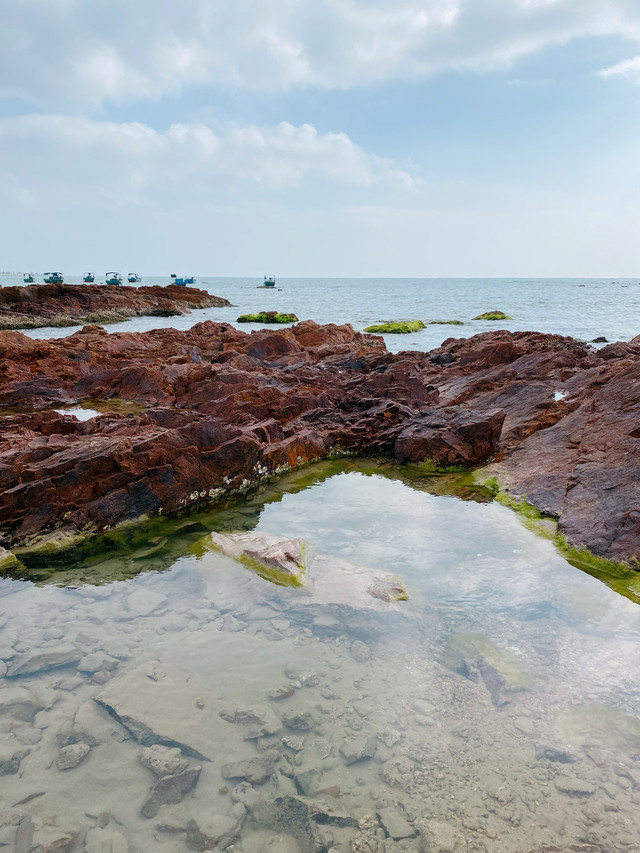 礁石布满在将近一公里长的海滩上,石头被长年累月的积累出苔藓,与偏绿的海面交相辉映;这里的沙子特别细软,涨潮时海水灌在礁石间隙中的“天然小泳池”里,有许多鱼虾小螃蟹躲在里面,水非常的清澈。