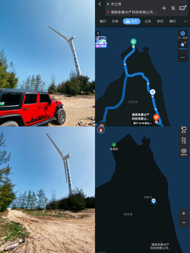 交通:从“木兰湾”导航至“阜康水产科技公司”,但是开往沙滩的入口并不在目的地这里哦!是在开了将近三分之二路程时一个小岔口,也就是下方右上图的位置这里,当你看到一座巨大的风车时(下方左上图),就代表到了,下方左下图就是开往沙滩的路,这里开下去总体难度不大,只要是越野车(城市SUV不算),司机有基本的越野驾驶经验,就没什么大问题。