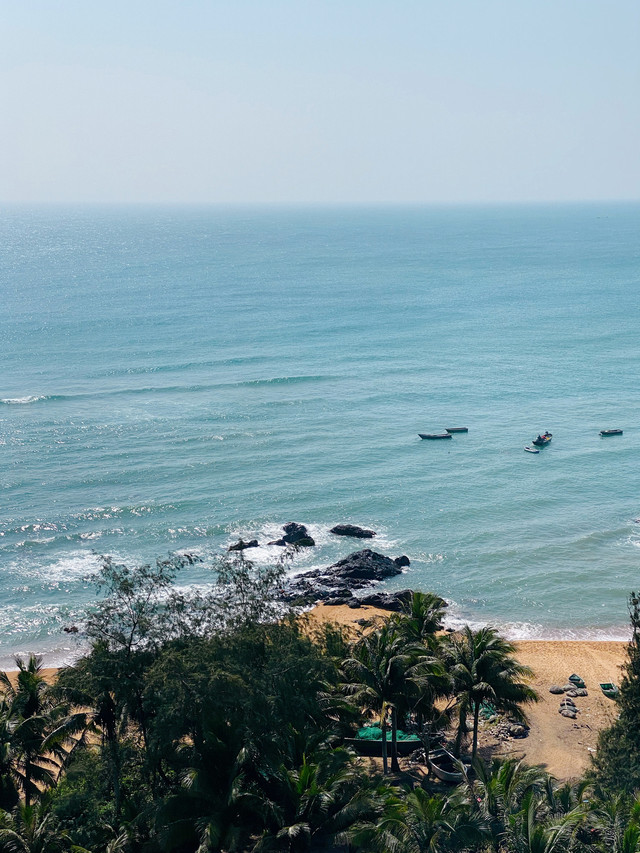虽然路很烂,但从上往下俯瞰山钦湾海滩的画面非常美,蓝天大海、礁石海滩配上椰林植被,个人觉得这里的景色美过了燕子洞!