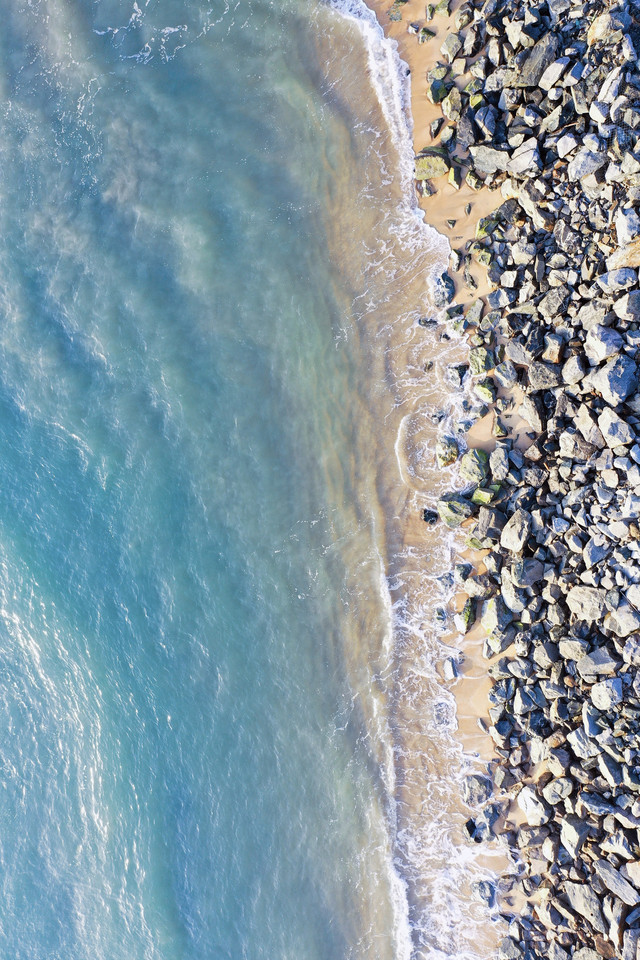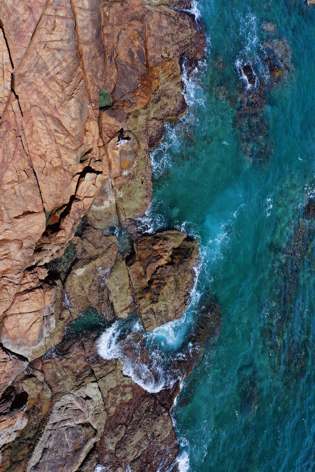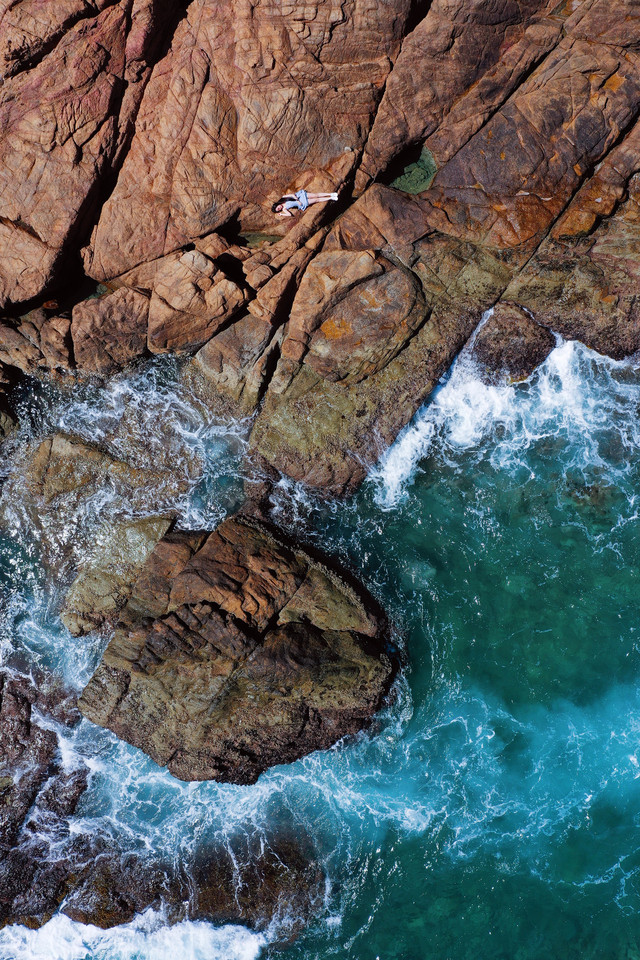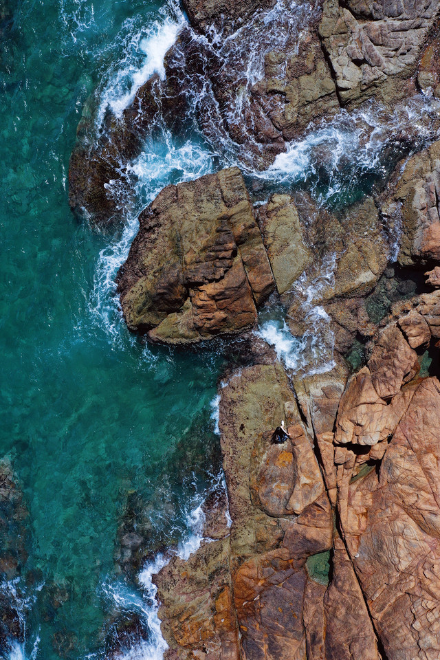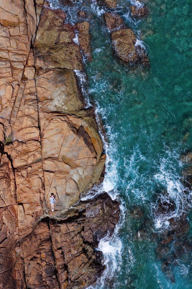 到达清水湾旅游区后,跟着人群往沙滩方向走,看到沙滩后继续朝着右边走,当看到一个观景的木头台阶步道后就到了,步道下面是许多坑坑洼洼的礁石,在退潮时,石头会露在外面,可以一点点沿着礁石往海里走,然后让无人机从上面的观景步道上起飞,就能拍出只属于你一个人,与海融为一体的大片啦!