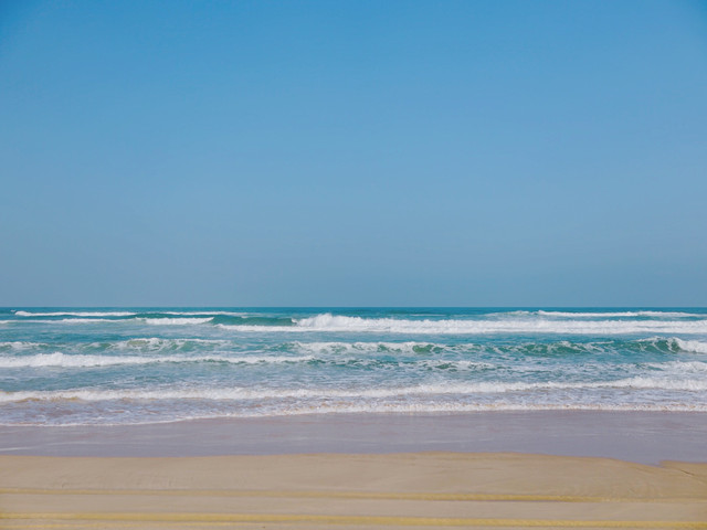 我们去的这天刚退潮没多久,沙滩很多地方还是湿的,没有办法开很长一段路,只能绕圈圈开,也不敢离海面太近开,要知道一旦在湿滑的沙滩里陷车,自己是没有任何办法自救的,车的重量会随着松软的沙子一直往下陷,在救援来之前估计车子就已经报废了。