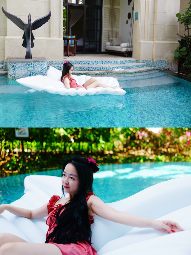 整体是欧式城堡的建筑风格,公共区域有着大片的草坪,在阳光的照耀下真的好美;一楼直通泳池的房间,是这里最火爆的房型,我们到的比较晚了,只剩下最边上的一间,不过我觉得挺好的,脚可以跨出去到泳池对面拍照,其他房间只能游过去哈哈~ 酒店内还可以租泳圈道具,35元/次,女生看了都会很心动吧。