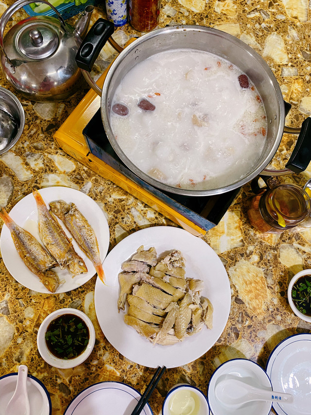 文昌鸡和我们想象中不太一样,吃惯了上海的白斩鸡和三黄鸡的我们,觉得文昌鸡的肉有一点点老,但配着酱汁味道还是很好的。