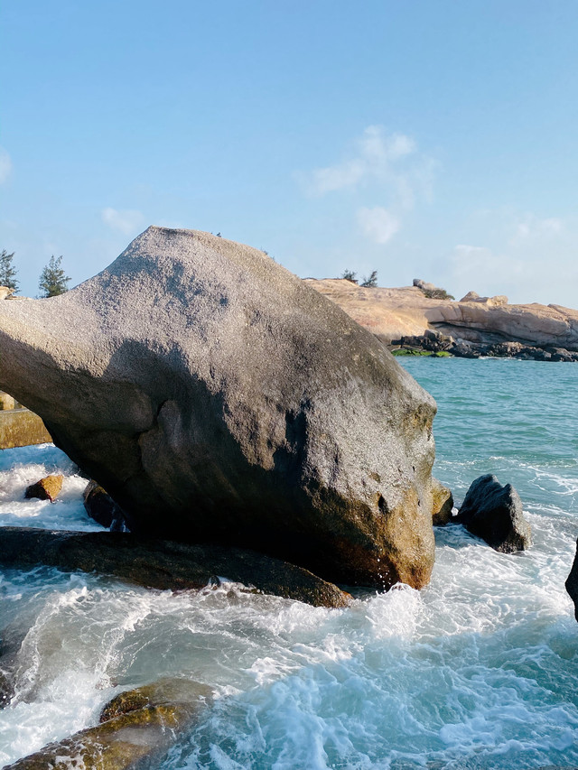 同样位于整座海南岛最东角的石头公园,是数万年前造山运动隆出地表的石头,饱经潮汐的拍打雕琢而形成如今的景象。石头形状各异,有些像海龟和古猿,还有些较为平整光滑,随着海浪的不断拍打,造就了独一无二的模样,使得这里的景象尤为野性的壮观。