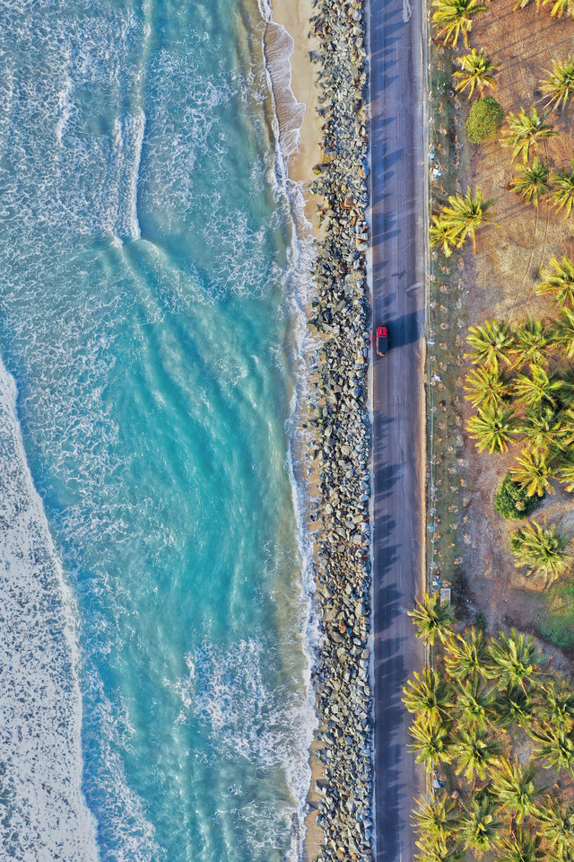 当我们第一次行驶在这条路是下午5点的时候,沙滩上有很多人,沿海公路停满了各种鲜艳的跑车,大家都在争相占位拍照,当时我们直接开过并没有停下,毕竟人一多拍照体验感就会瞬间下降,航拍也会变得不好看。