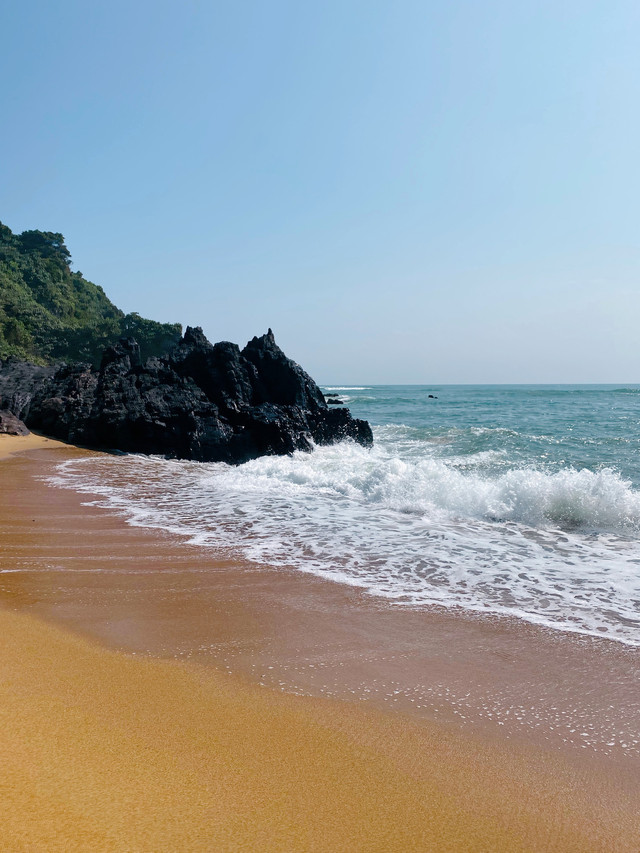 这里的沙子很厚,但整体偏粗黄,配上黑色礁石有一种野性美,海水非常的蓝,干净透彻。