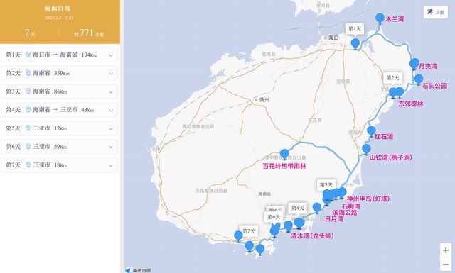 由于搭上前后坐飞机的时间一共只有7天,对于自驾来说还是比较赶的,只能把环线自驾计划暂时搁置,定下了东南半圈的路线。整体行程属于“虎头蛇尾”,前面几天要去的地方多,需要赶路比较艰辛,越往南开越轻松,泡酒店躺尸游;但是!整个行程下来最让我惊喜和难忘的风景都在东部,此趟旅程也完全颠覆了我此前对海南无知的刻板印象,宝藏风景真的太多啦!