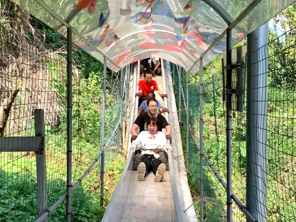 一家人顺着长长的旱滑道