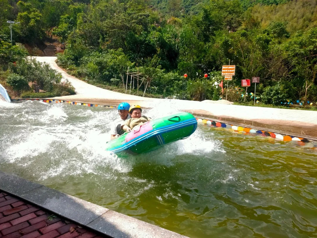 ,坐上皮筏艇,顺着长长的水滑道