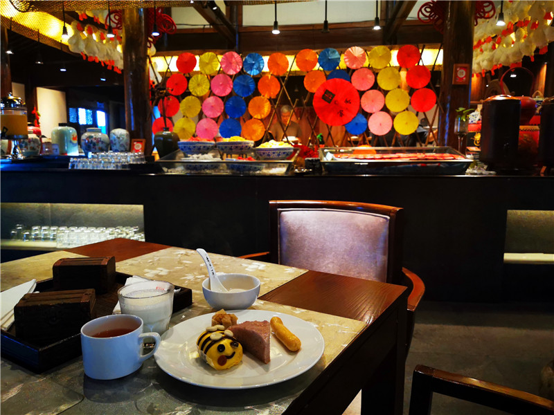 下山后坐公交回酒店,大家都已经起床用餐。我也抓紧用餐,酒店餐厅的早餐还算丰富。主要是品尝一些有特色的食物。